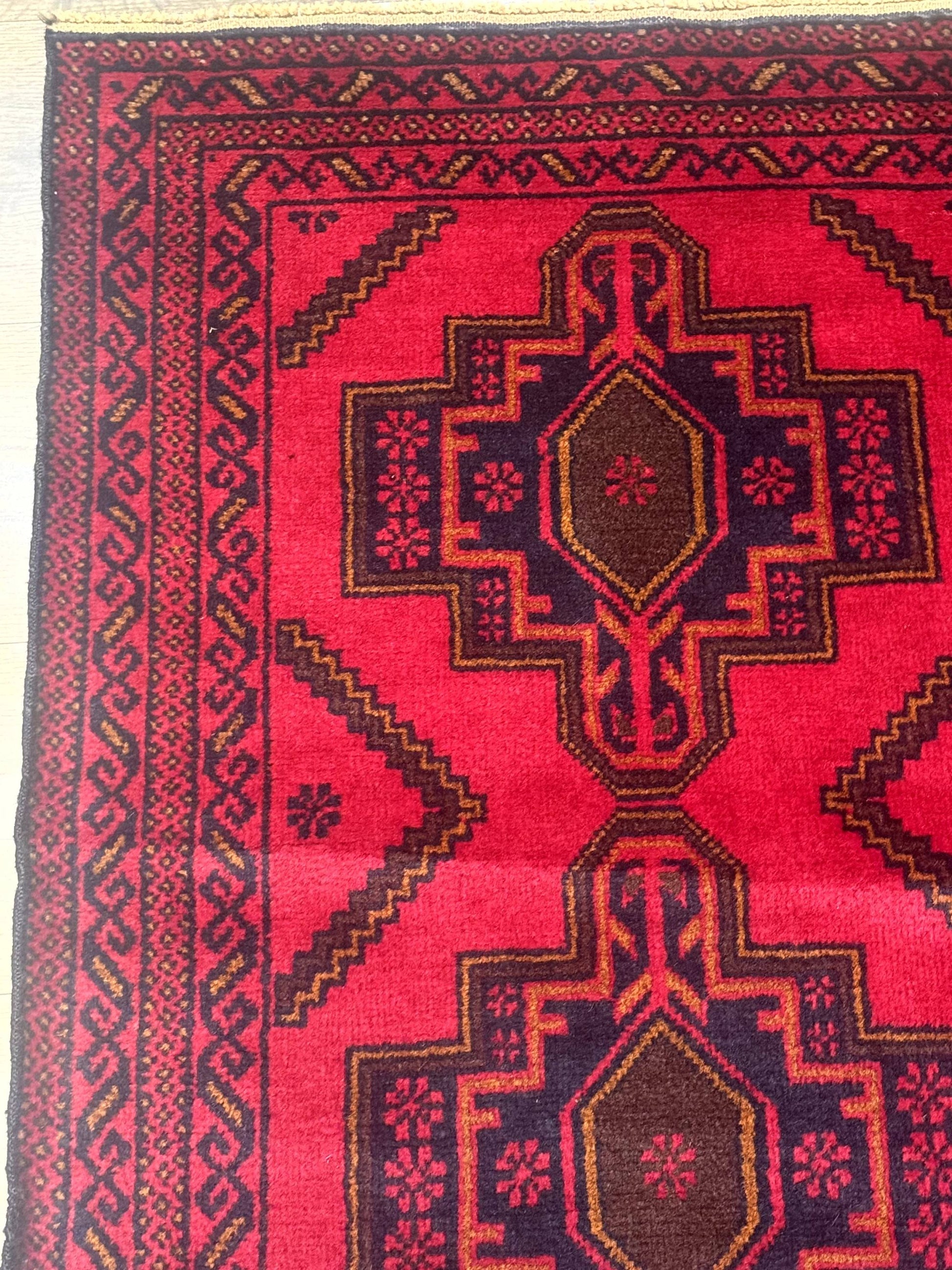This Afghan Balouch rug is a contemporary, handmade, hand-knotted wool piece designed to bring warmth, texture, and character to living spaces. Designed for modern homes seeking a durable, artisanal centerpiece, it features bold red and navy blue repeated medallions that adapt to various decor styles.