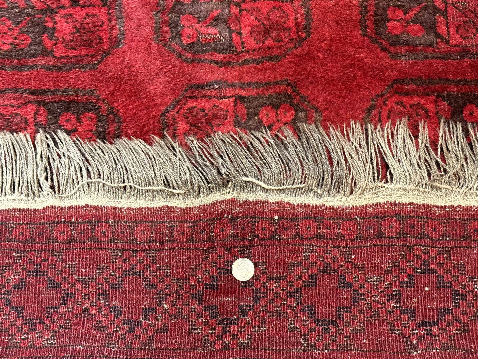An elegant, semi-antique Afghan Turkoman Bokhara Bashir rug in vivid red, sized 3'5" x 6'5". Hand-knotted from pure wool, it's built for spaces that crave timeless warmth and artisanal character.