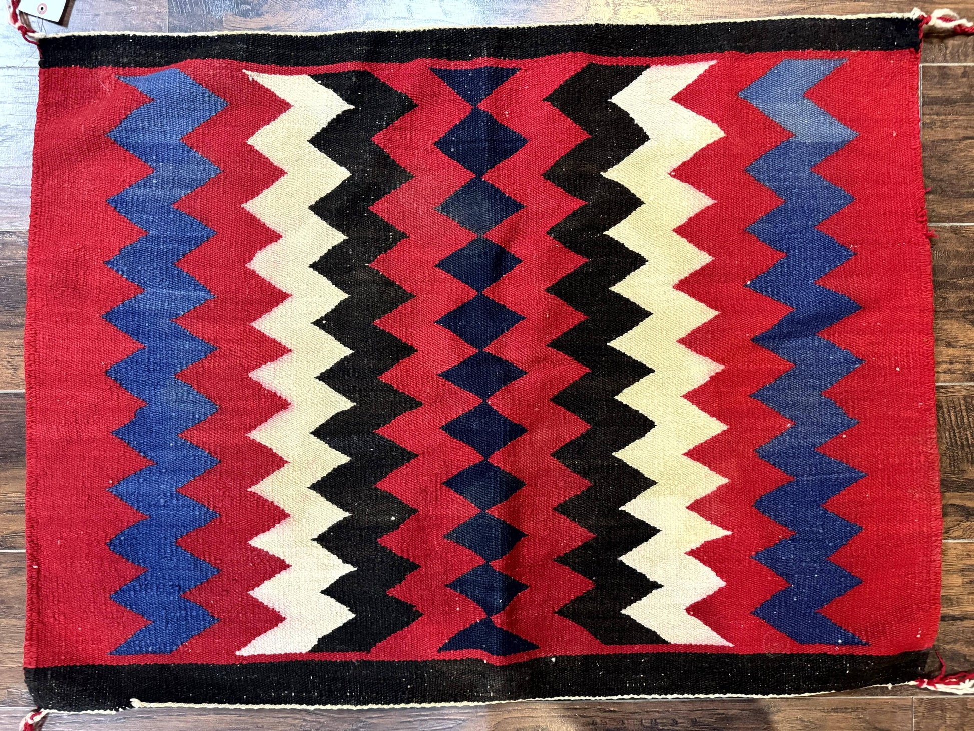 An authentic antique Navajo rug handcrafted and hand-knotted from wool, dating to the 1920s. Sized at 3'7" x 2'8", this red, ivory, black, and blue zigzag rug brings warmth, texture, and a touch of history to any space.