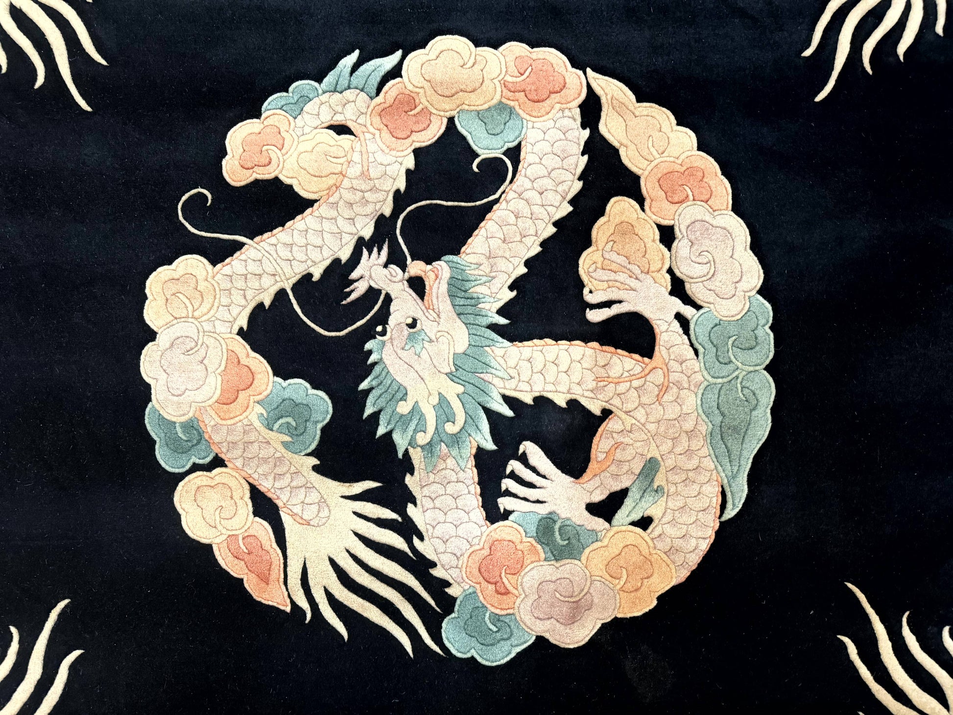 Experience durable, high-quality wool underfoot with a refined hand-knotted construction that stands up to daily use. The dragon motif and rainbow borders add texture and color depth, creating a striking focal point that complements both classic and contemporary interiors. Its generous size fits living rooms and dining spaces, while its timeless design provides warmth, sophistication, and lasting charm. Professionally cleaned, it’s ready to enhance your space right away.