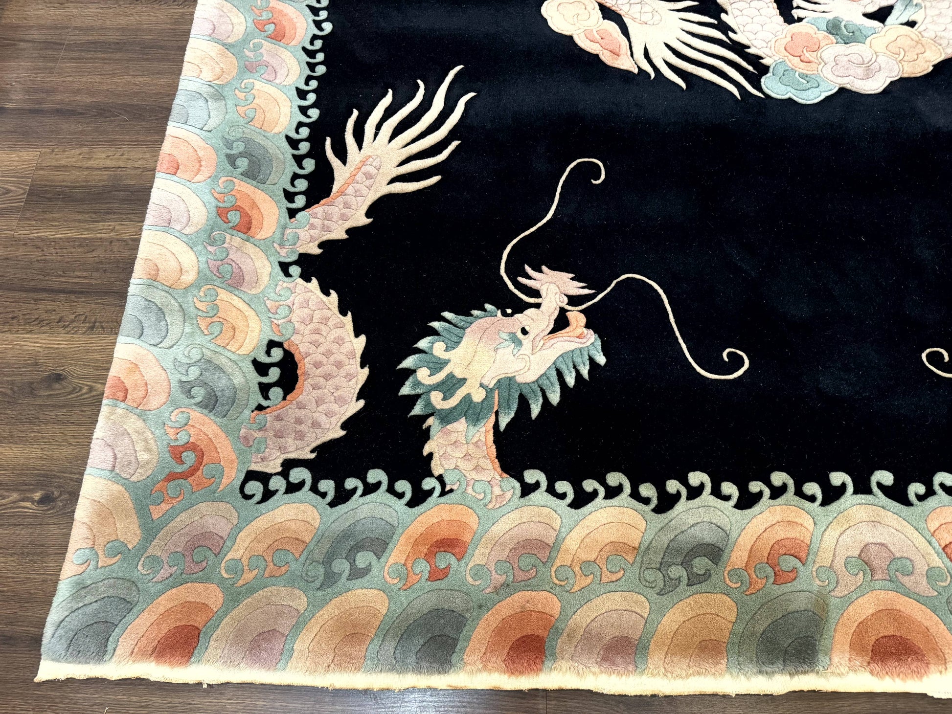 Black Chinese Wool Rug 8x10 Hand Knotted Dragons With Rainbow Borders