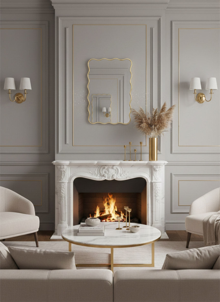 Cuelgue uno sobre la repisa de la chimenea para darle un toque escultural al punto focal de la habitación. O deje que un espejo ondulado plateado con una curva ingeniosa amplifique la luz natural en un pasillo y guíe la mirada con su elegancia fluida.