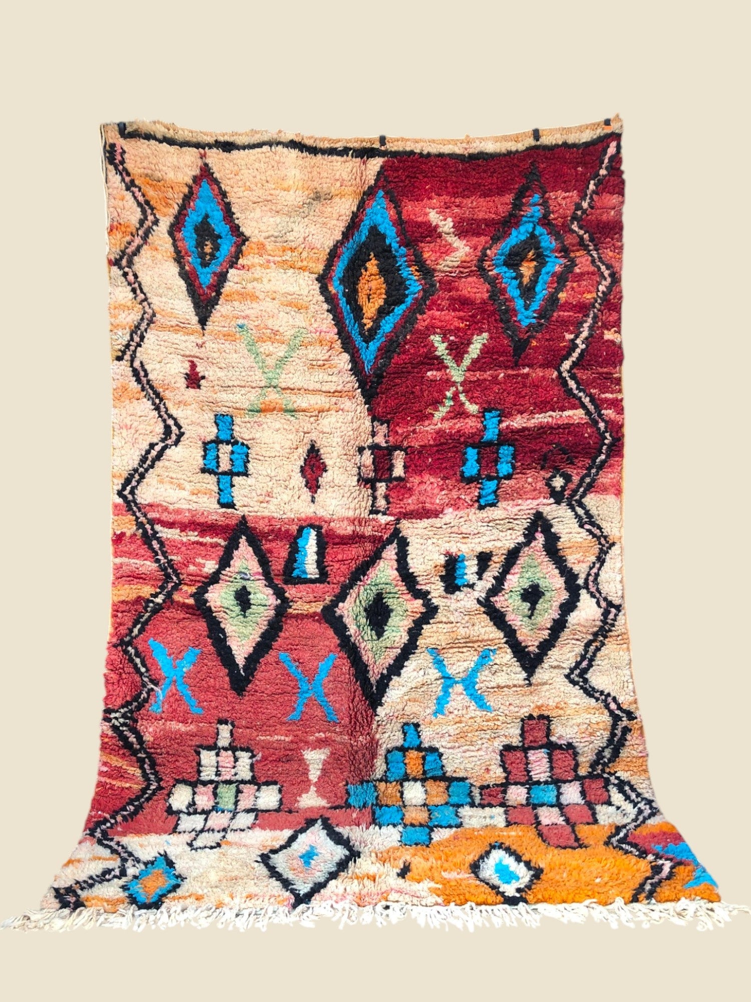 Add a bold statement to your space with the Fatima Moroccan Rug, a one-of-a-kind handwoven piece crafted by Berber artisans in the Atlas Mountains. This vintage wool rug features rich reds, warm oranges, and vivid blues arranged in intricate geometric and tribal motifs that reflect centuries of Moroccan weaving tradition.