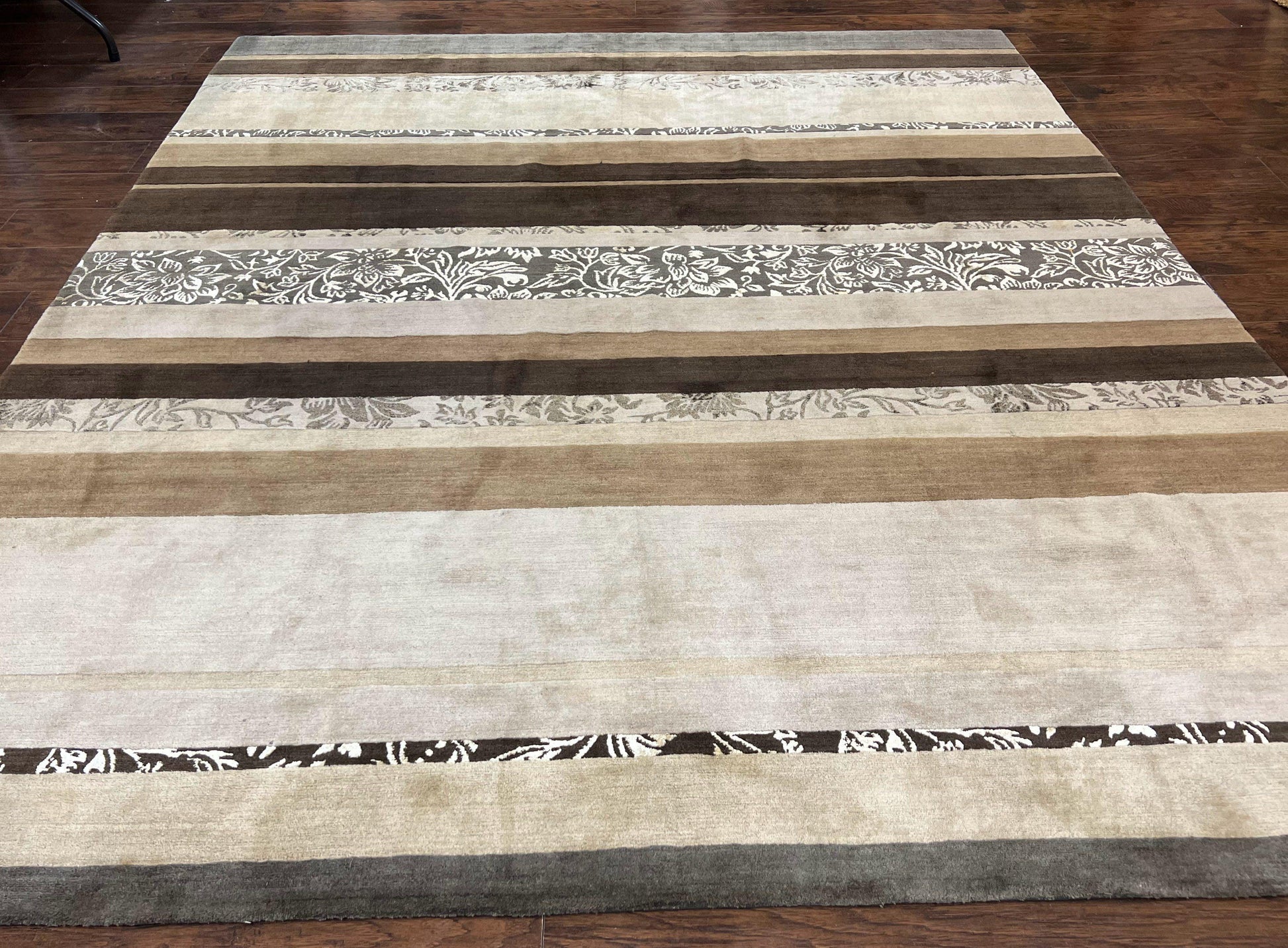 Bring a touch of artisanal elegance into your space with this vintage Tibetan/Nepali rug. Hand-knotted from wool with subtle silk highlights and a clean stripe pattern, it offers timeless appeal in a neutral palette of beige, tan, taupe, and brown. Sized at 8 ft 3 in by 9 ft 11 in, it fits a range of living areas, bedrooms, or entryways.