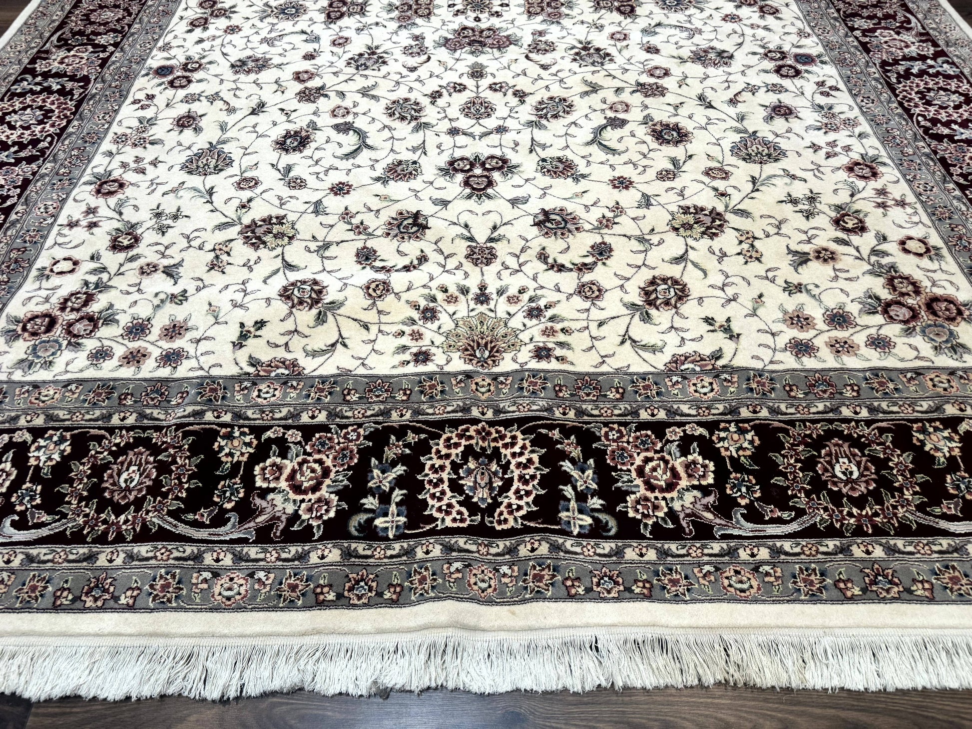 Sino Persian Rug 9x12 Hand Knotted Wool Silk Highlights Floral Allover Ivory And Dark Maroon