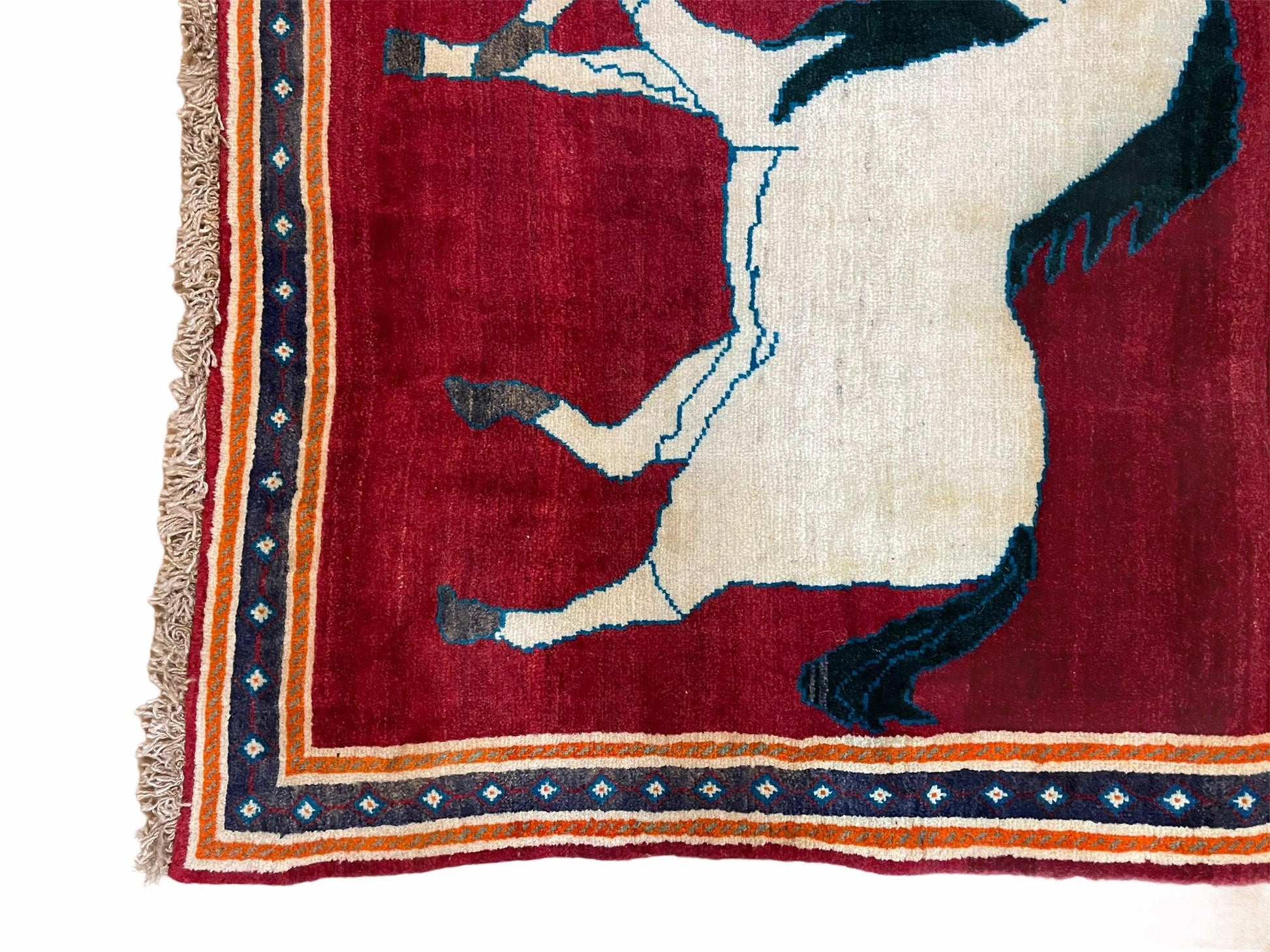 Experience timeless craftsmanship with this handmade, hand-knotted wool rug. New and unused, dating to the 1960s, it originates from the Zagros region and features a vivid pictorial design of two white horses on a red and white field. A beautiful way to transform any space with warmth and artistry.
