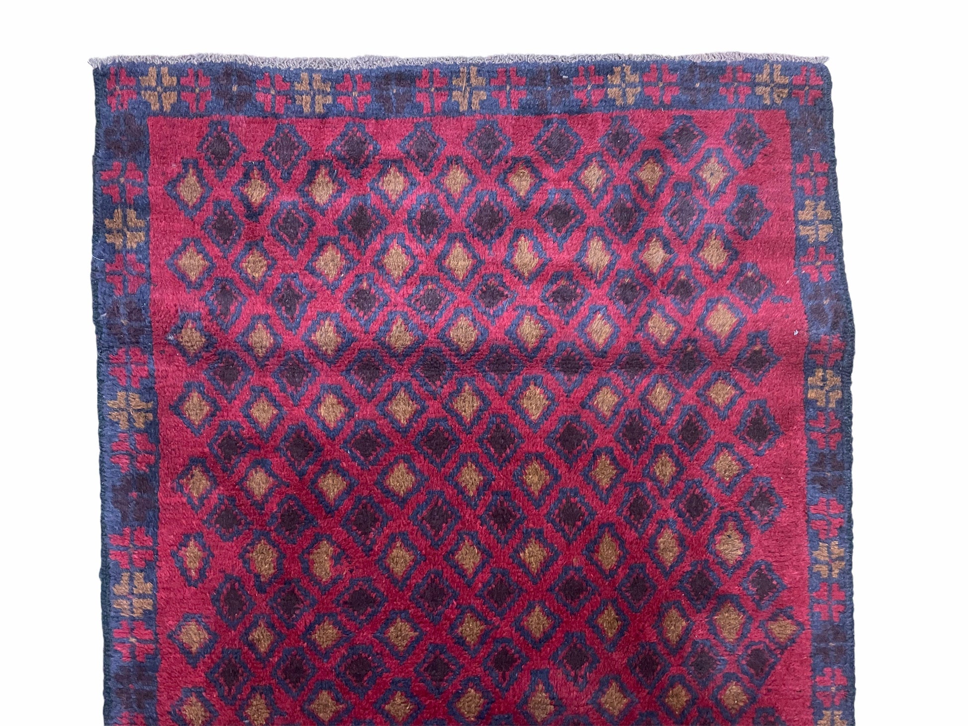 Vintage Handmade Balouch Afghan Wool Rug 3x5 Hand Knotted Red Blue Diamond