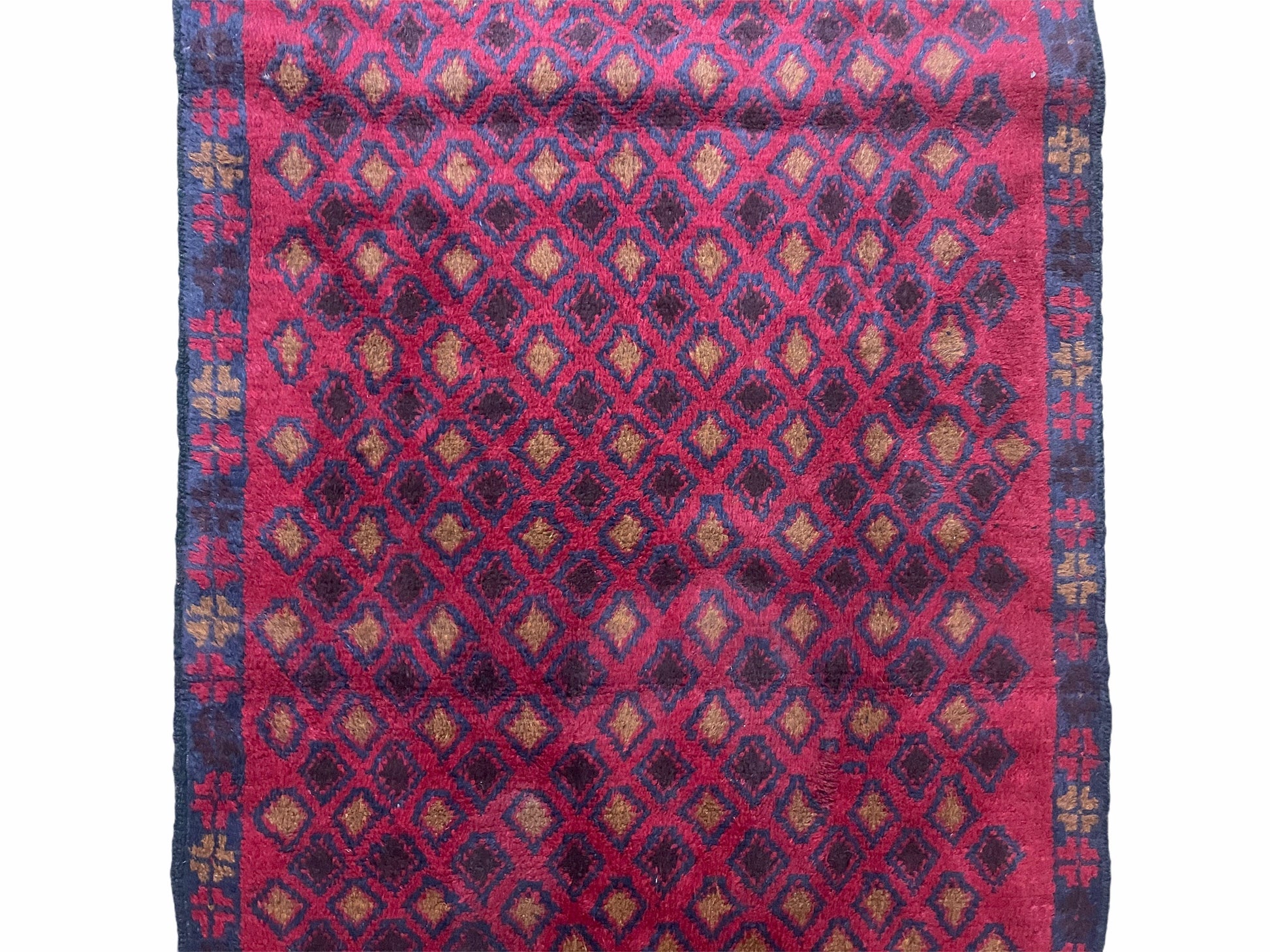 Discover a vintage handmade Balouch rug, a hand-knotted wool Afghan piece designed to elevate any space with warm color and artisanal character. Ideal for living rooms, bedrooms, or entryways, this 1980s Balouch rug brings timeless charm with a striking red and blue diamond pattern.