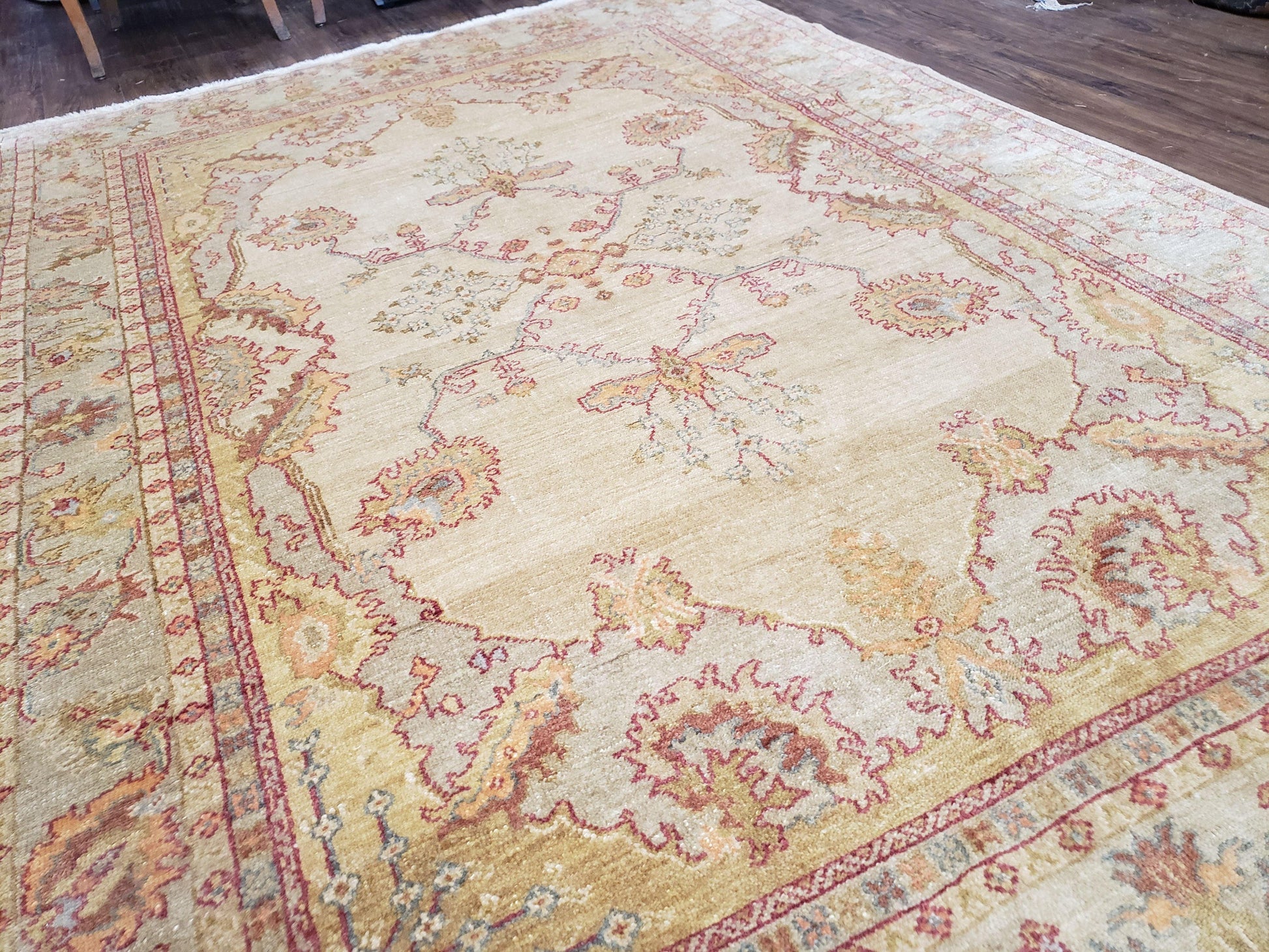This rug adds warmth, texture, and a touch of classic elegance to any room. The hand-knotted wool weave offers durability for daily use, while the soft pile remains comfortable underfoot. The beige and gold palette easily coordinates with a wide range of decor, from neutral to richly styled spaces, helping to anchor furniture and elevate the room’s ambiance. With its recent cleaning and excellent condition, it’s ready to be enjoyed in your space right away.