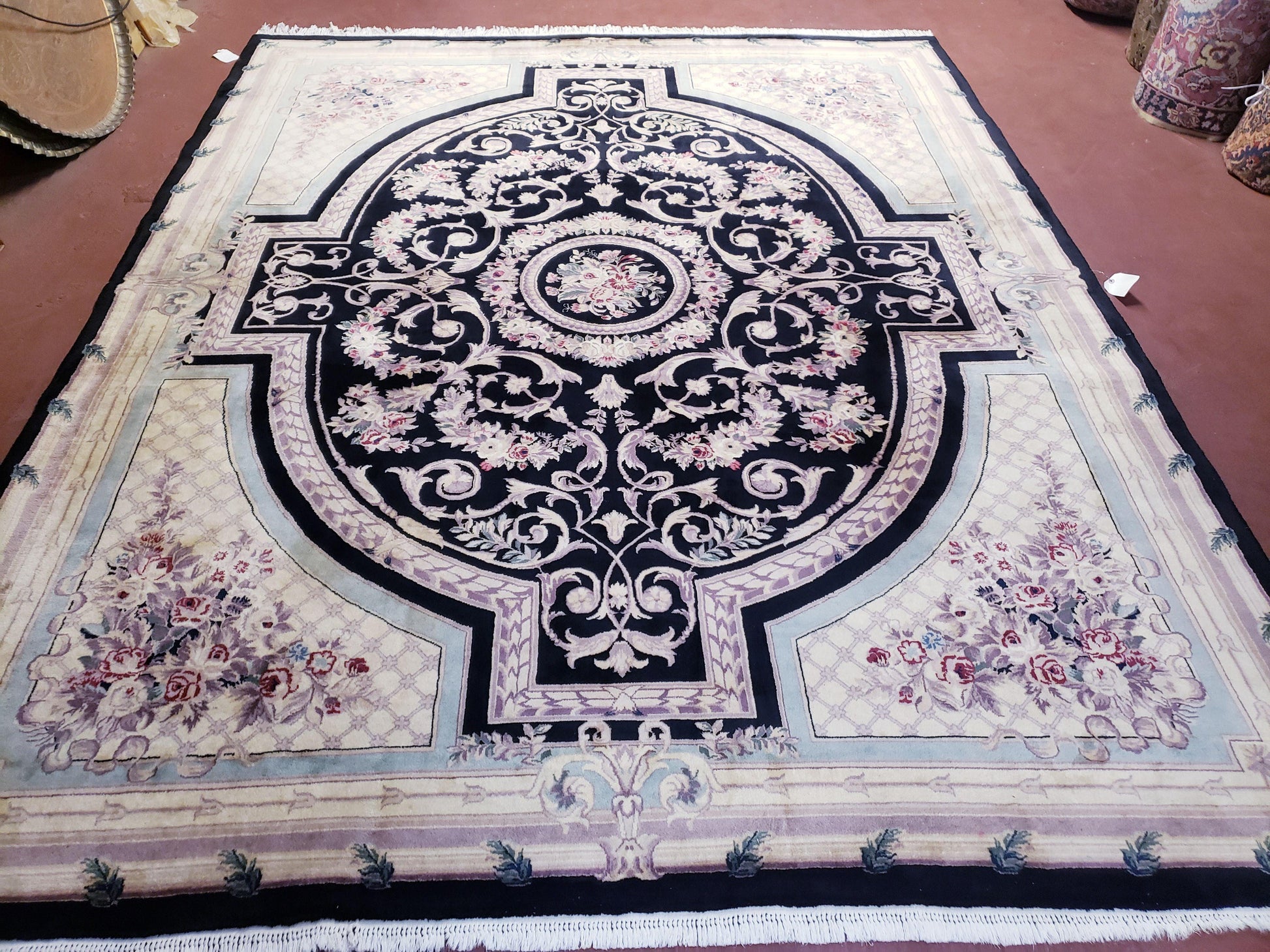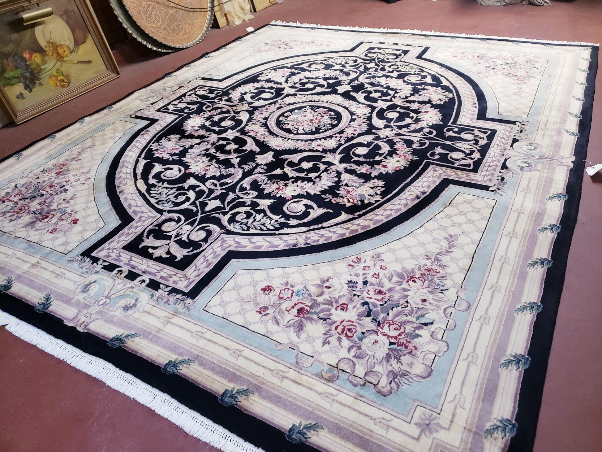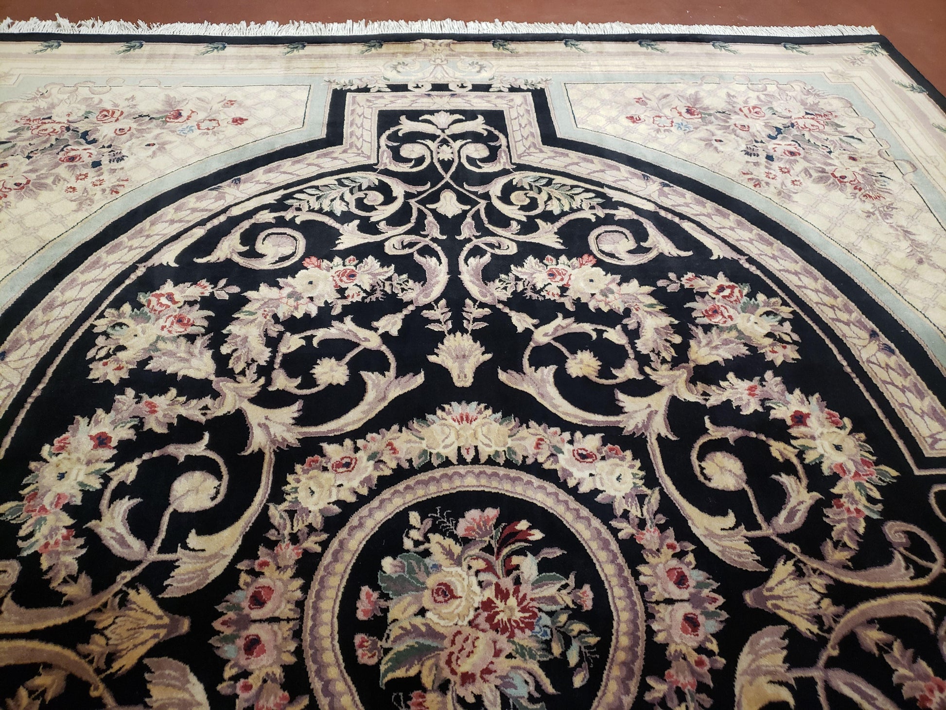 Aubusson Rug 8x10 Hand Knotted Wool Savonnerie Black Ivory French Design