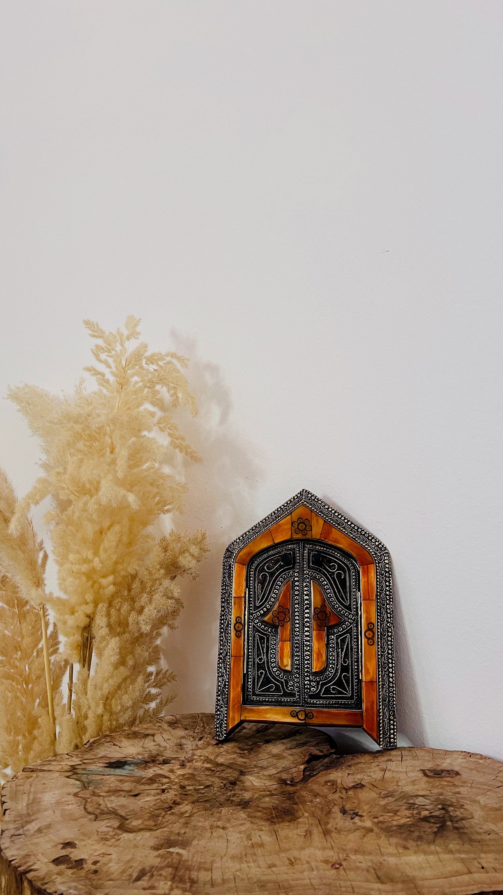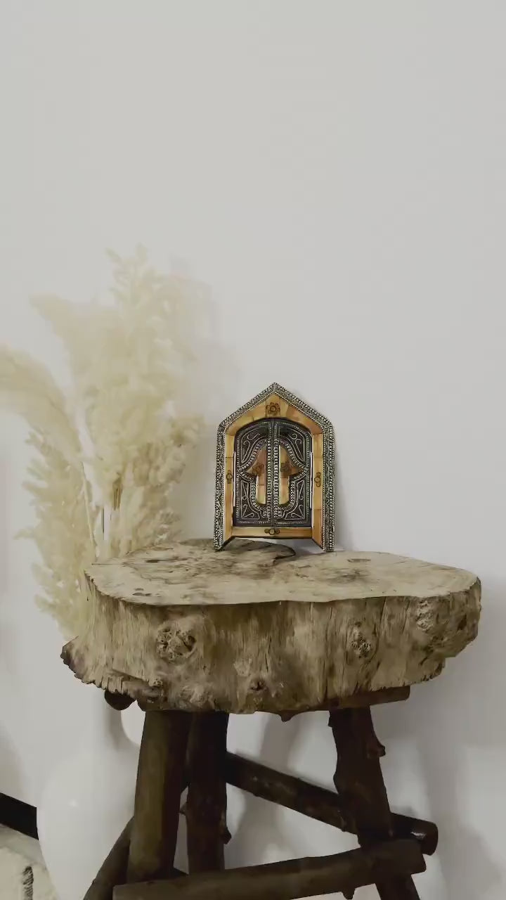 This Moroccan mirror is an excellent statement piece that will make any wall look incredible!!, It’s made by our highly skilled craftsman, the door of mirror engraved with Hamsa, in Morocco The Hamsa Hand or Hand of Fatima is a protective sign. It brings its owner happiness, health luck, & good fortune. This amazing Wall Mirror made of glass, wood, brass & cow bone, the cow bone is dyed with Moroccan henna ( a dye made from the plant “Lawsonia inermis”), the mirror has a hook in the back, you can hang it on your wall easily. it would look beautiful in any living room, entryway, bedroom, or dining room.