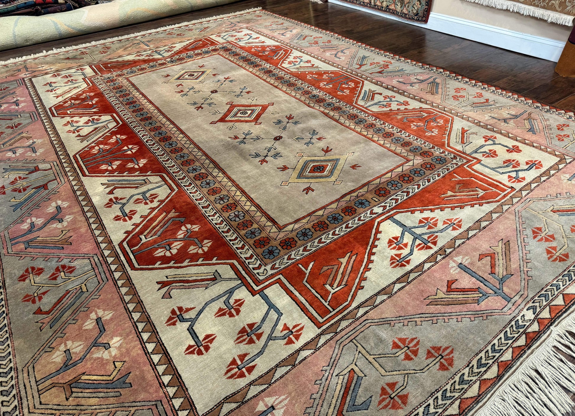 Discover the timeless elegance of a large Turkish Milas rug. This vintage, hand-knotted piece is crafted in Turkey and finished in a wool-on-wool construction that adds warmth, texture, and character to any space.