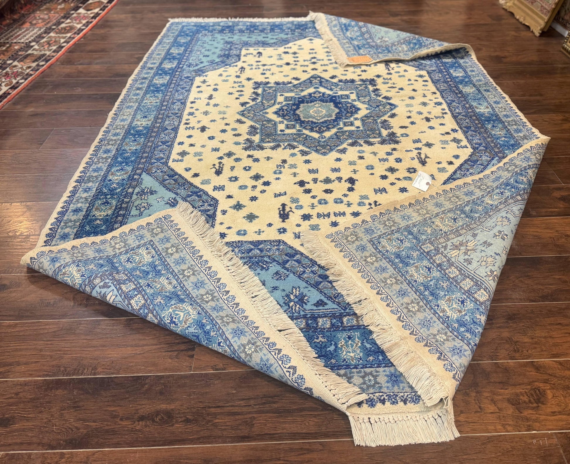 Enjoy a rug that brings instant warmth and texture to your space without overpowering other design elements. The hand-knotted wool construction offers durability and a soft underfoot feel, while the geometric medallion adds a timeless focal point. Its blue and ivory palette complements a wide range of decor styles—from modern to traditional—making it a versatile foundation for living rooms, bedrooms, or entryways. With a recent cleaning, you can place it confidently in your space and start enjoying its refined, enduring charm.