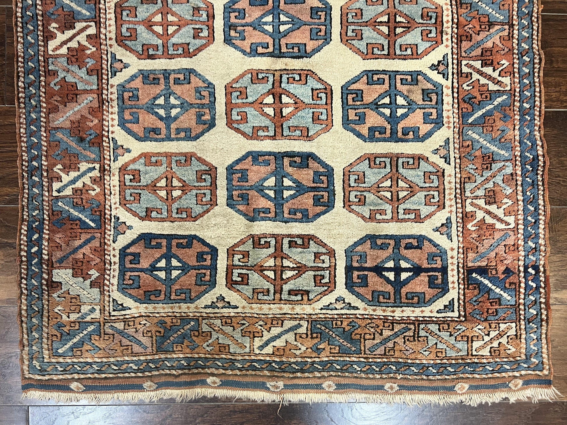 This vintage Turkish Kazak rug is hand-knotted from wool, offering enduring character and artisanal quality for any space. Sized at 3 ft 5 in by 4 ft 1 in, it fits well in living rooms, bedrooms, or entryways while adding a soft, inviting touch with its geometric tribal motif in cream, red, and blue.