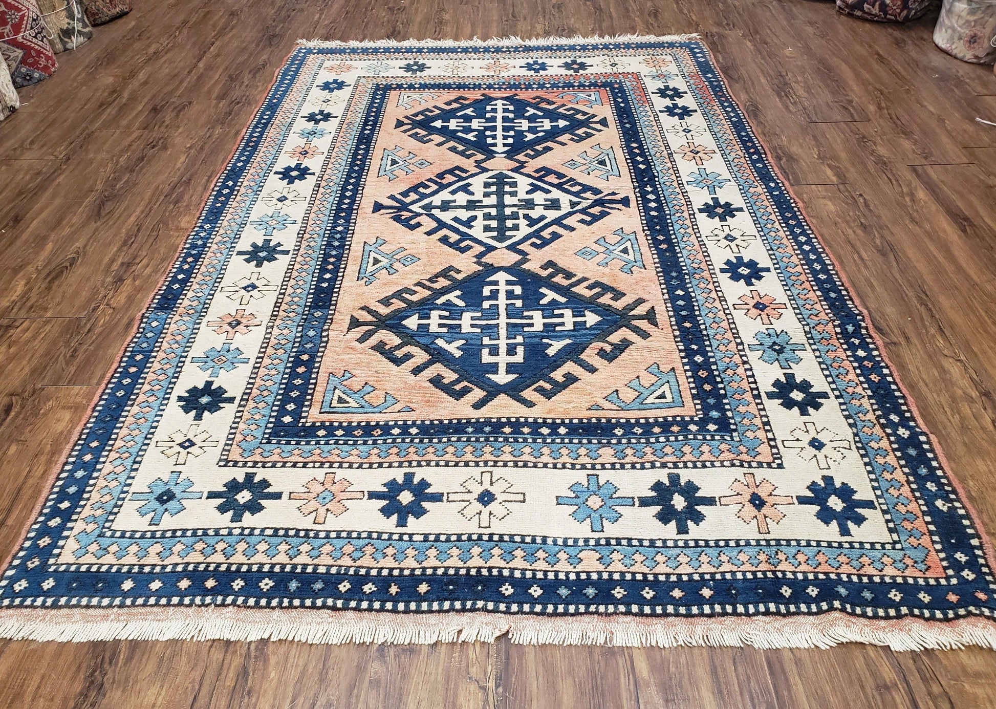 Discover a vintage Turkish Kazak rug hand-knotted in rich wool, designed for spaces that value character and lasting quality. In blue and ivory with subtle desert sand and light blue accents, this piece adds bold geometric charm to living rooms, bedrooms, or entryways.