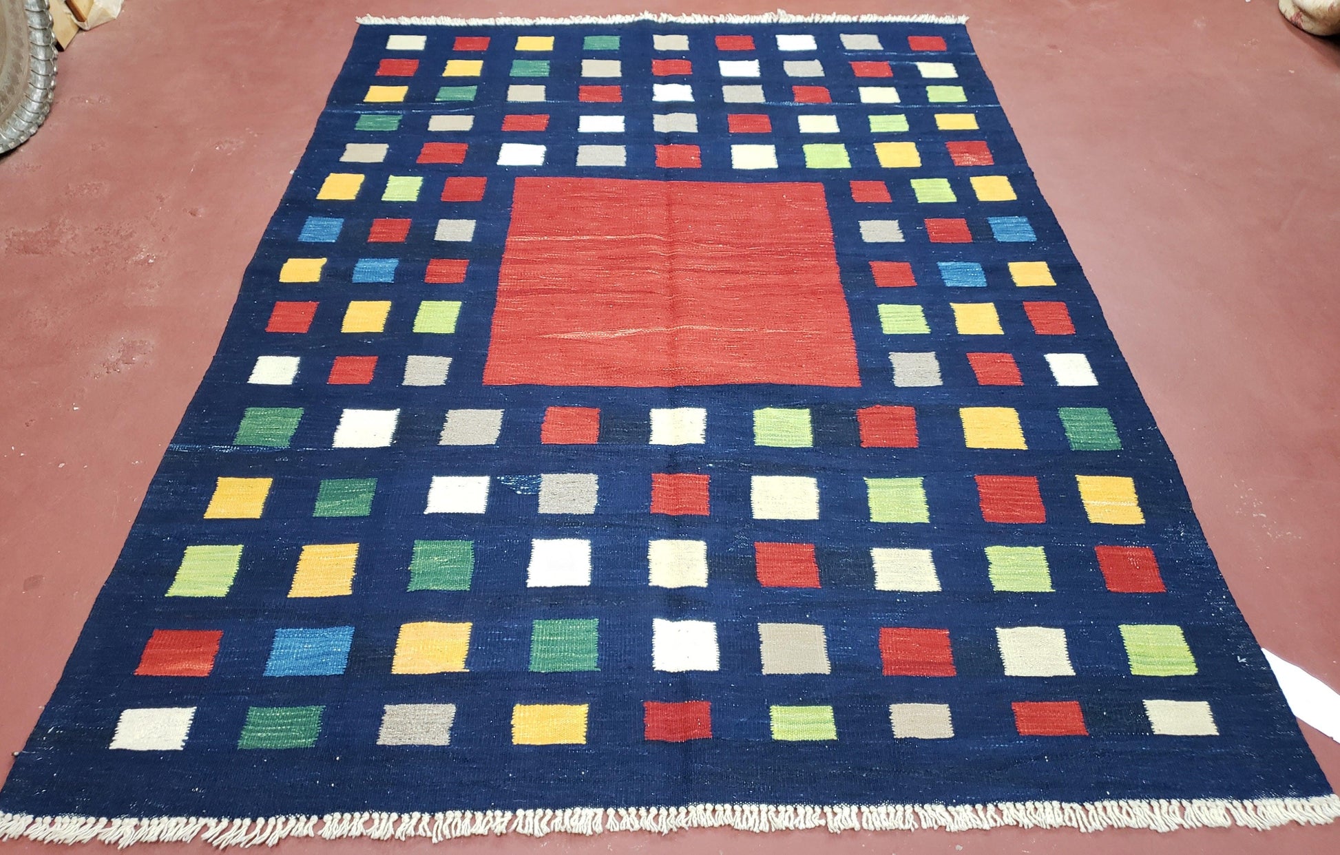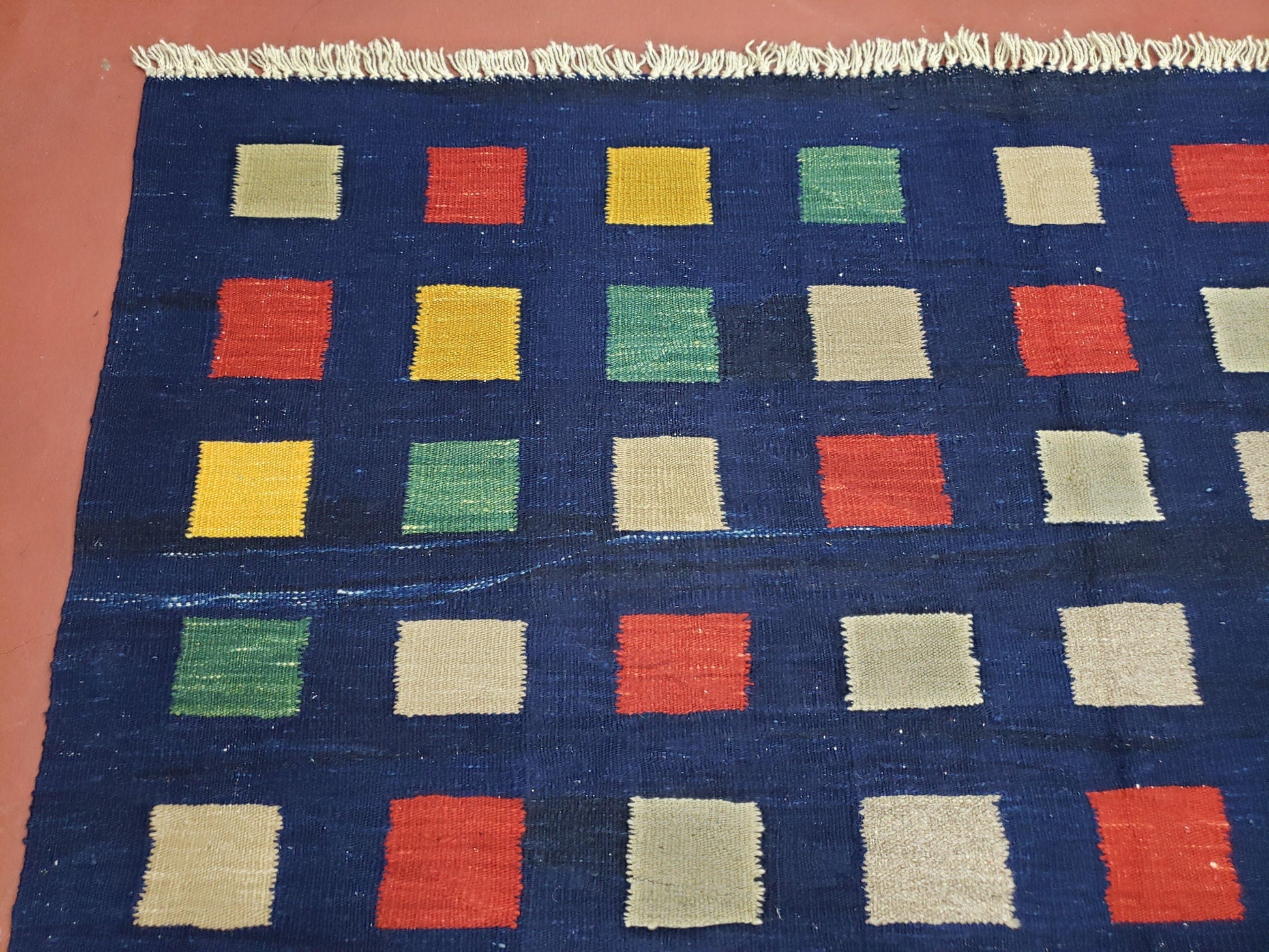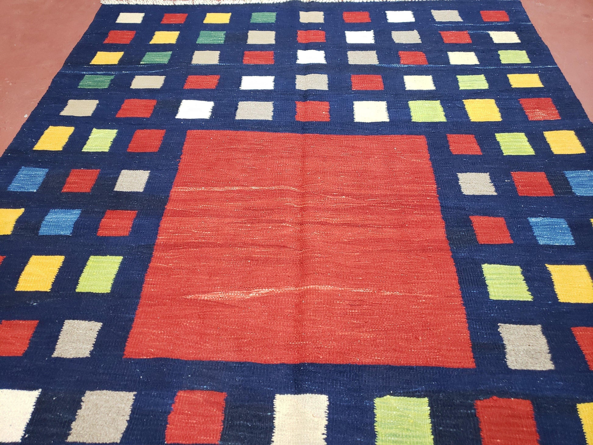- Color & Pattern: Dark blue, red, yellow, green, ivory, gray, and multicolor in a classic checkerboard Kilim design