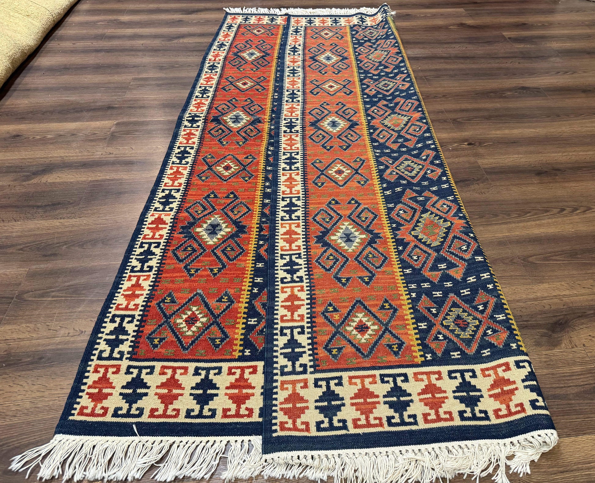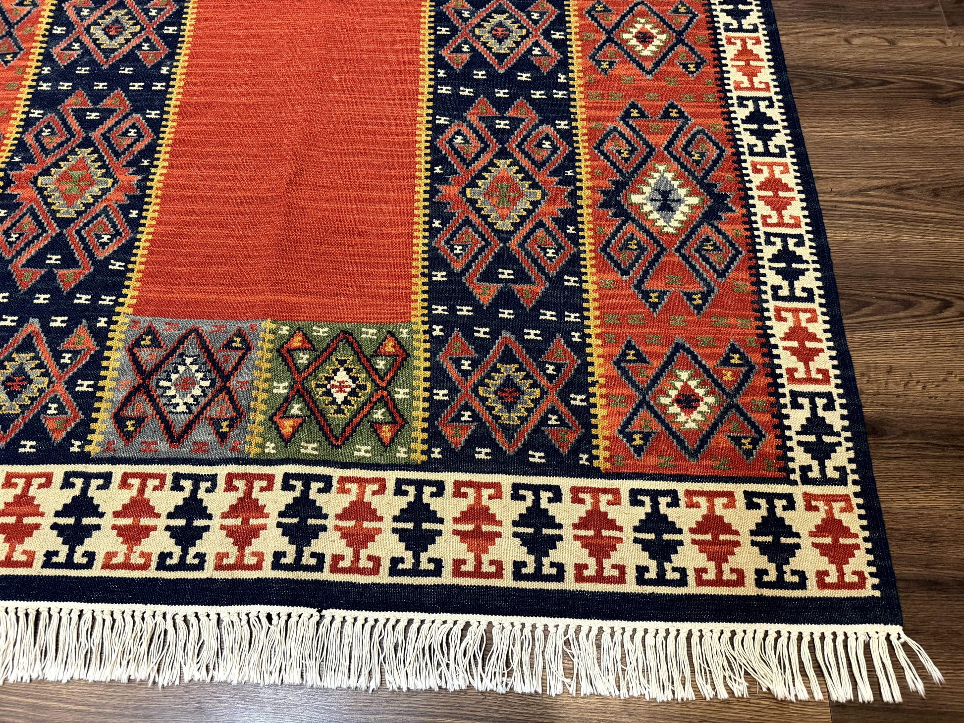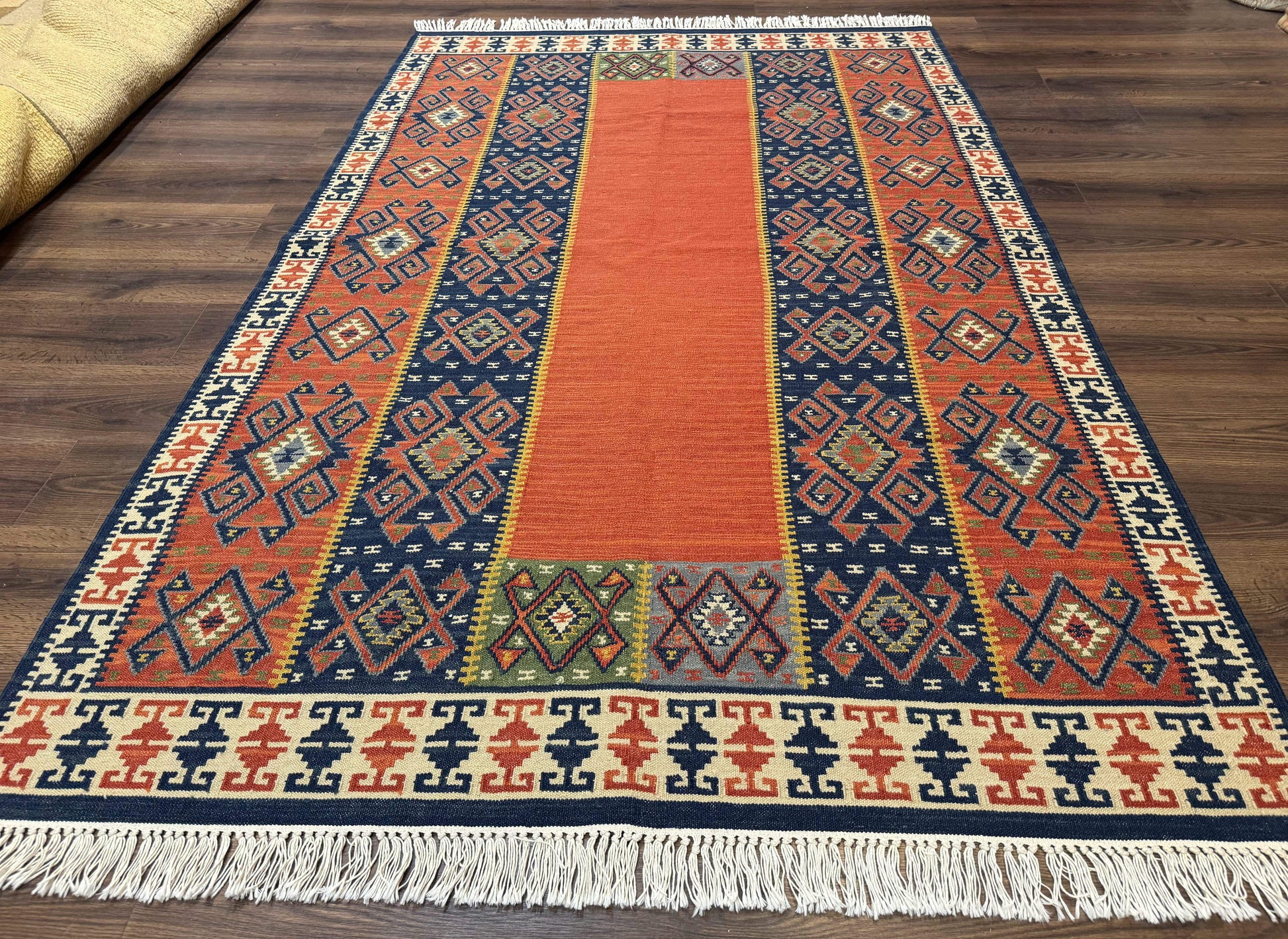 Turkish Kilim Rug 5x8 Handmade Flatweave Bohemian Carpet Terracotta Navy