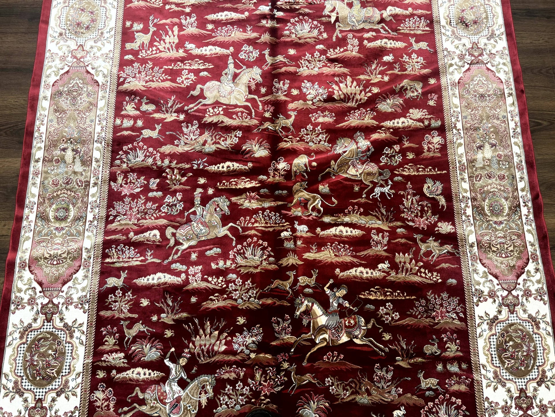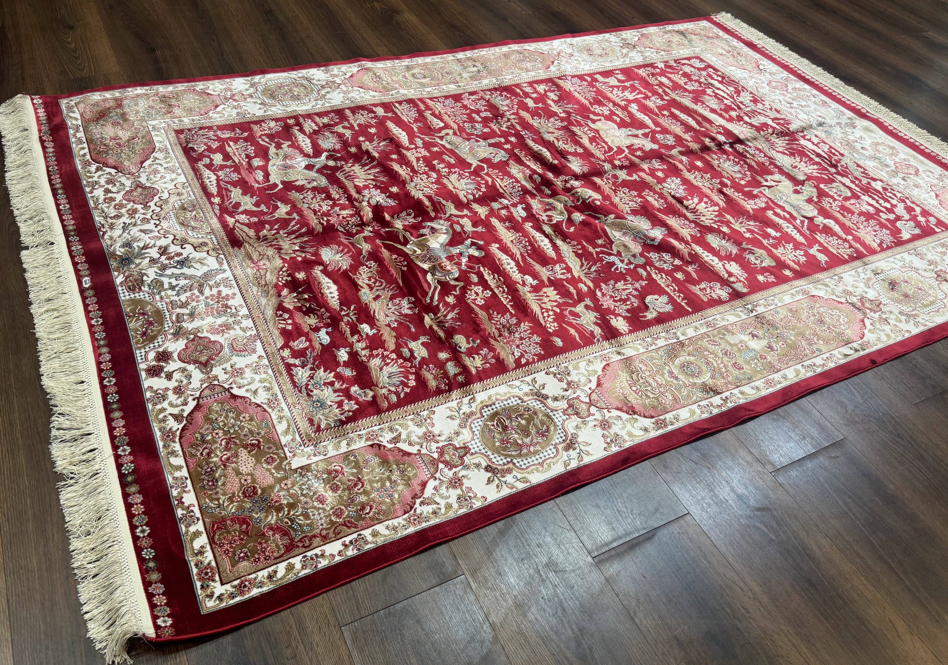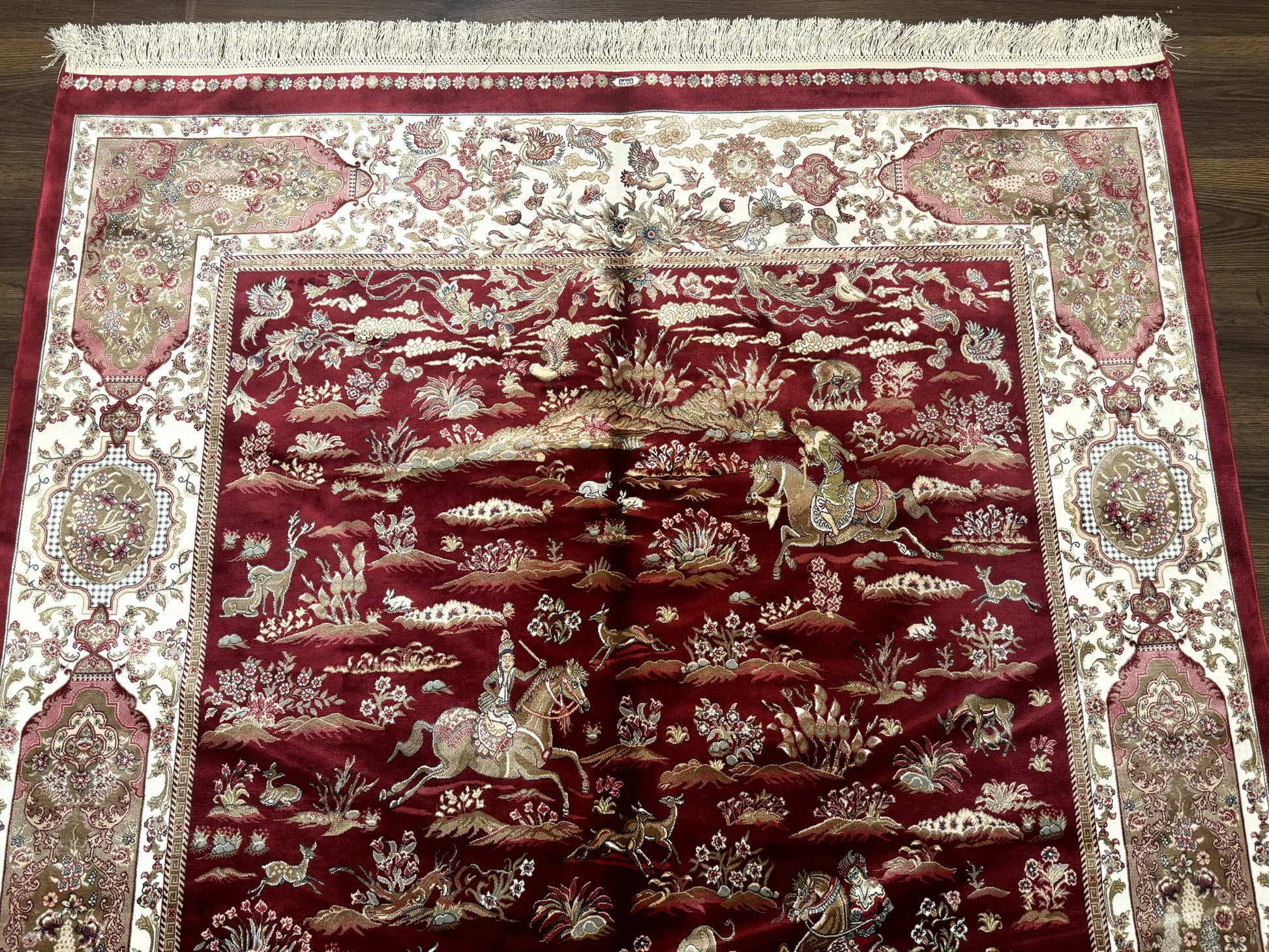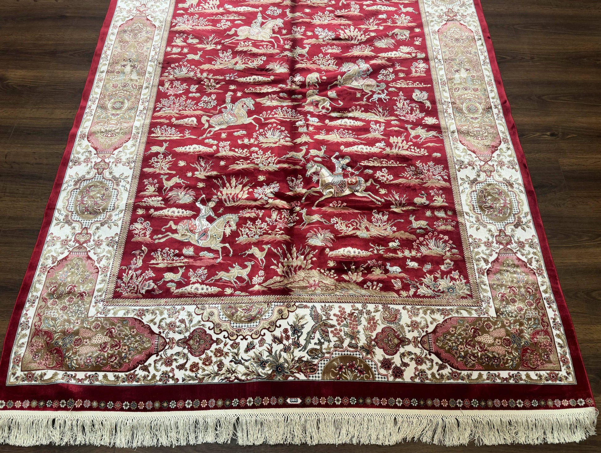 Turkish Silk Hunting Scene Rug 5 x 7.6 ft Red And Ivory Bamboo Silk