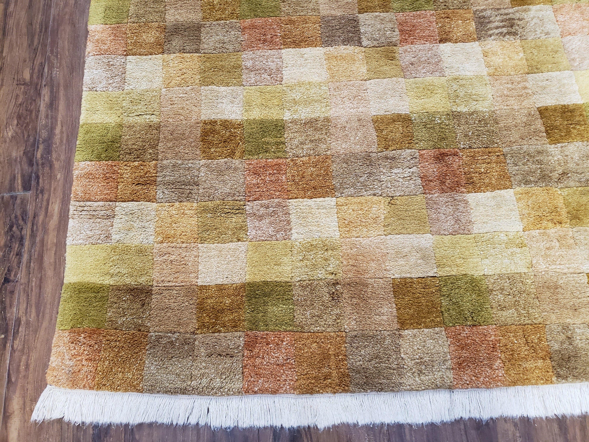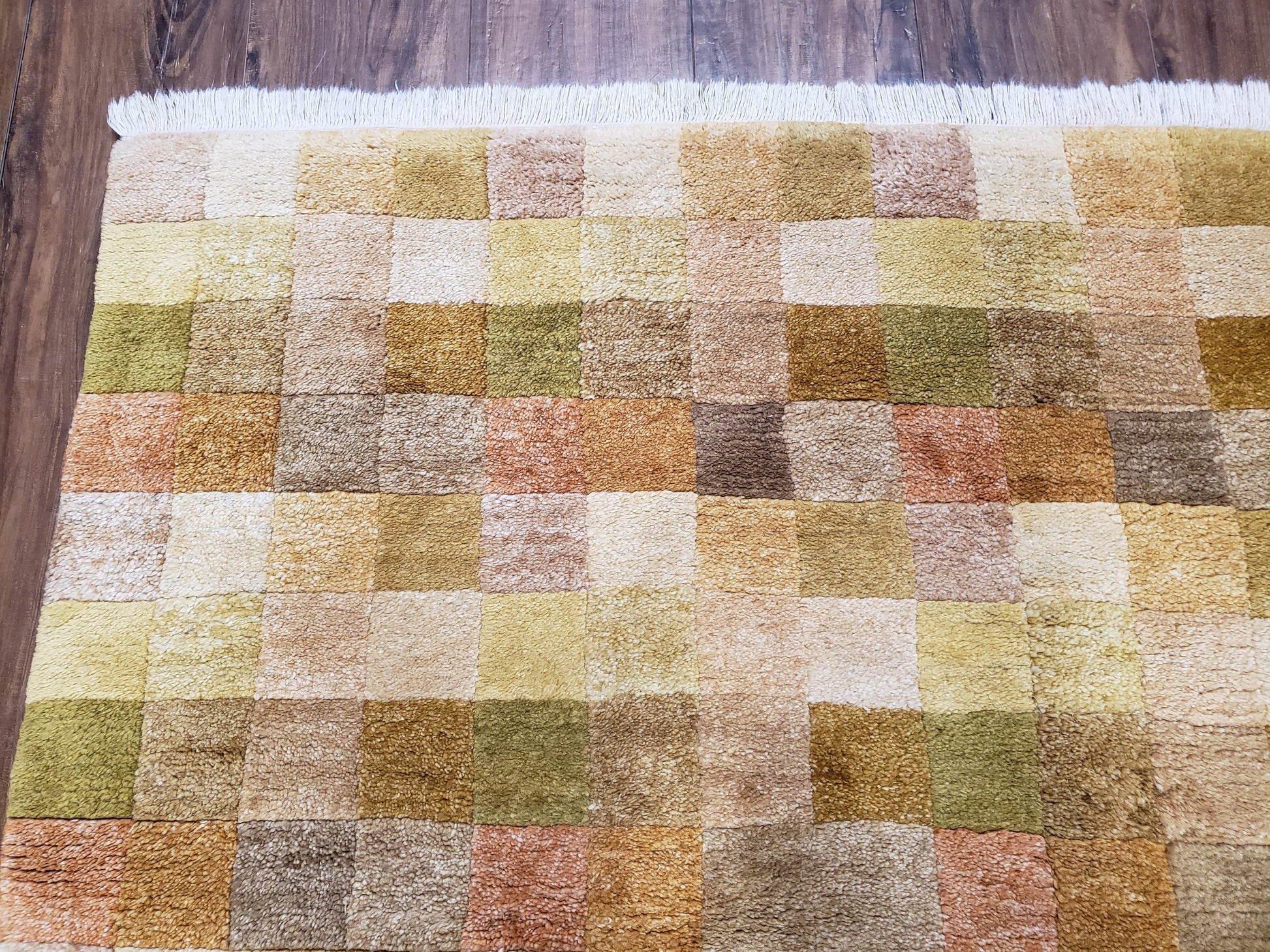 Tibetan Rug 4x6 Modern Abstract Handmade Area Rug With Checkerboard Pattern Ivory Gold Tan