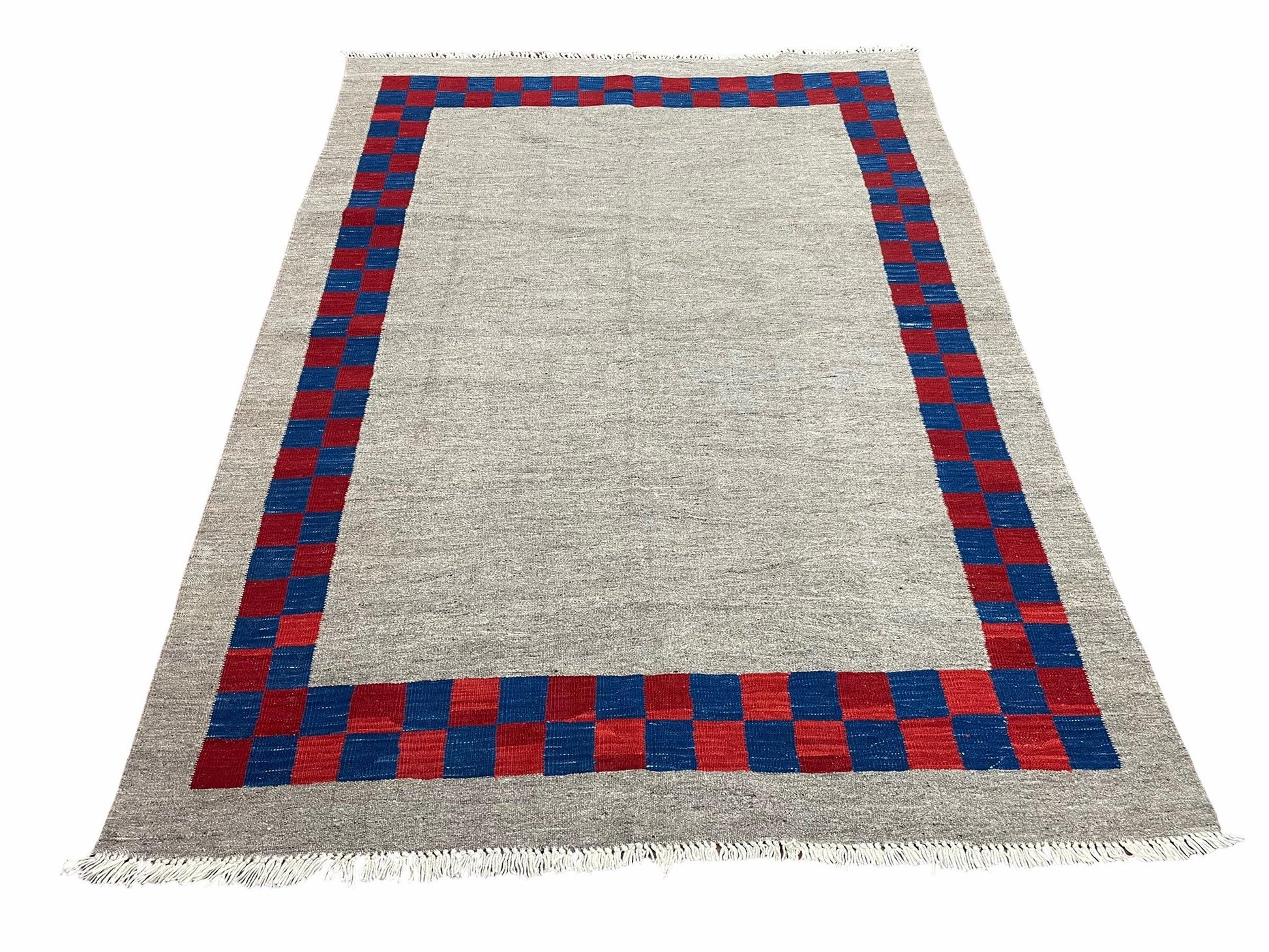 Geometric Kilim Rug Handmade Wool Hand Knotted Gray Blue Red Checkerboard