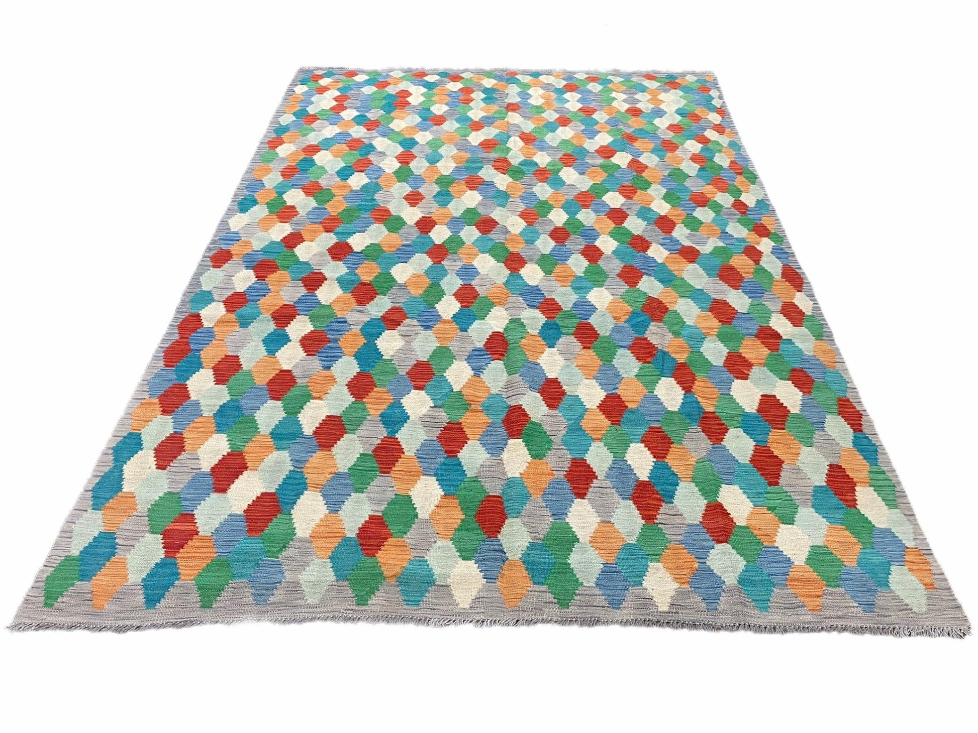 Colorful, hand-knotted Wool Chobi Kilim rug that instantly brightens any space. Sized at 6'6" x 9'6" and handmade in Turkey, this new, multicolor Kilim is perfect for playrooms, living rooms, or bedrooms seeking warmth and personality.