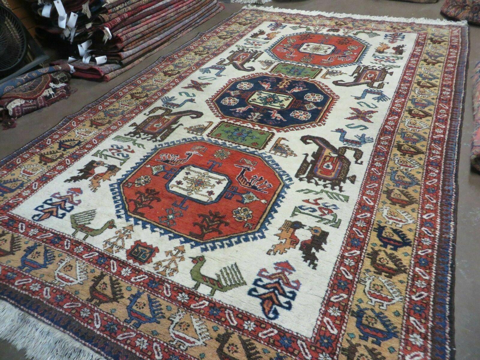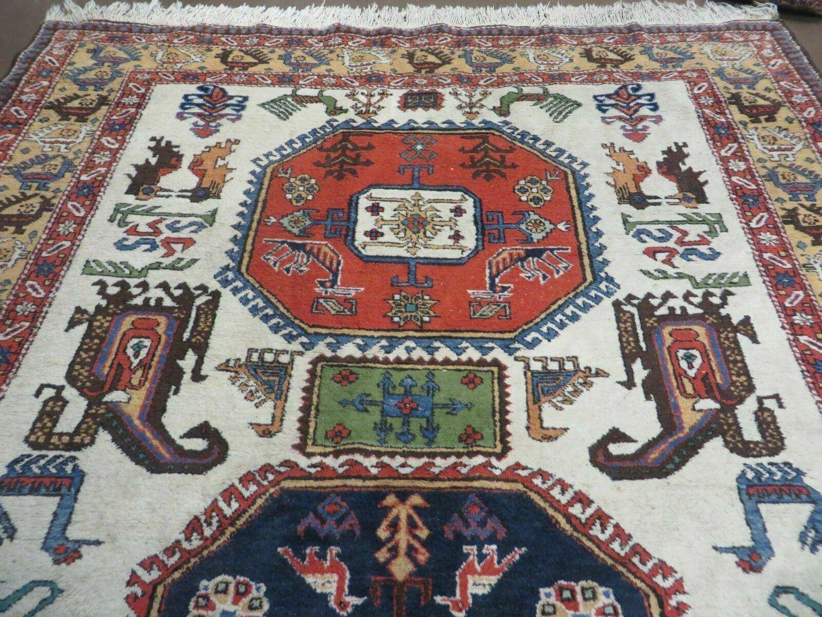 Turkish Knotted Wool Rug Vintage 7x10 Birds Animal Ivory Handmade Organic