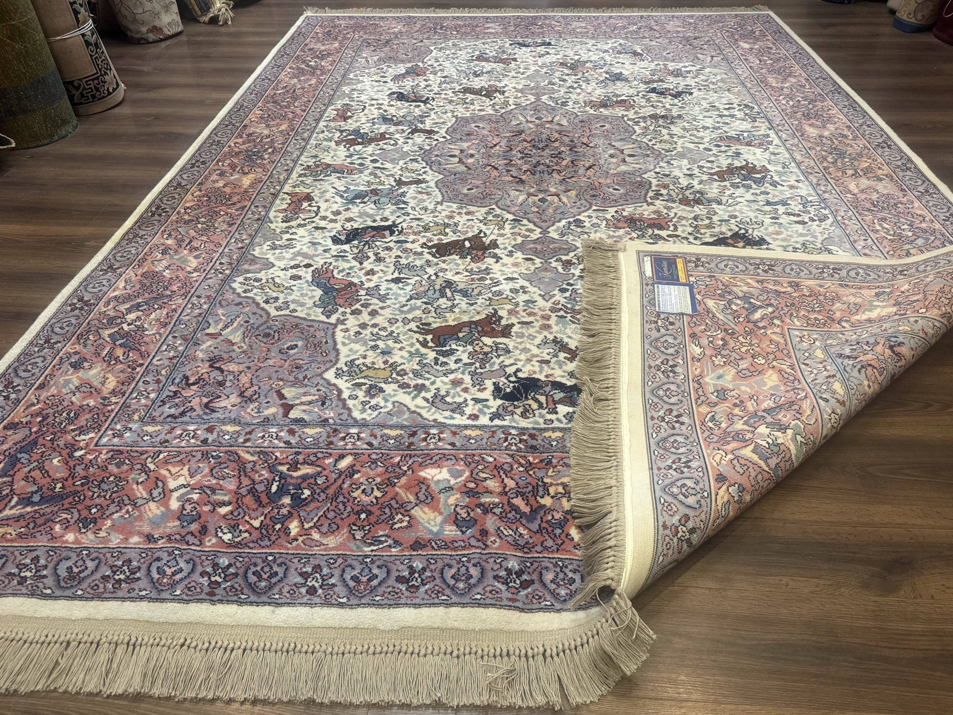 Discover a rare vintage Karastan rug: the 8'8" x 12' Ivory Hunting #751. This wool power-loomed piece from the 1980s brings timeless craftsmanship and a soft, versatile color palette to any room.