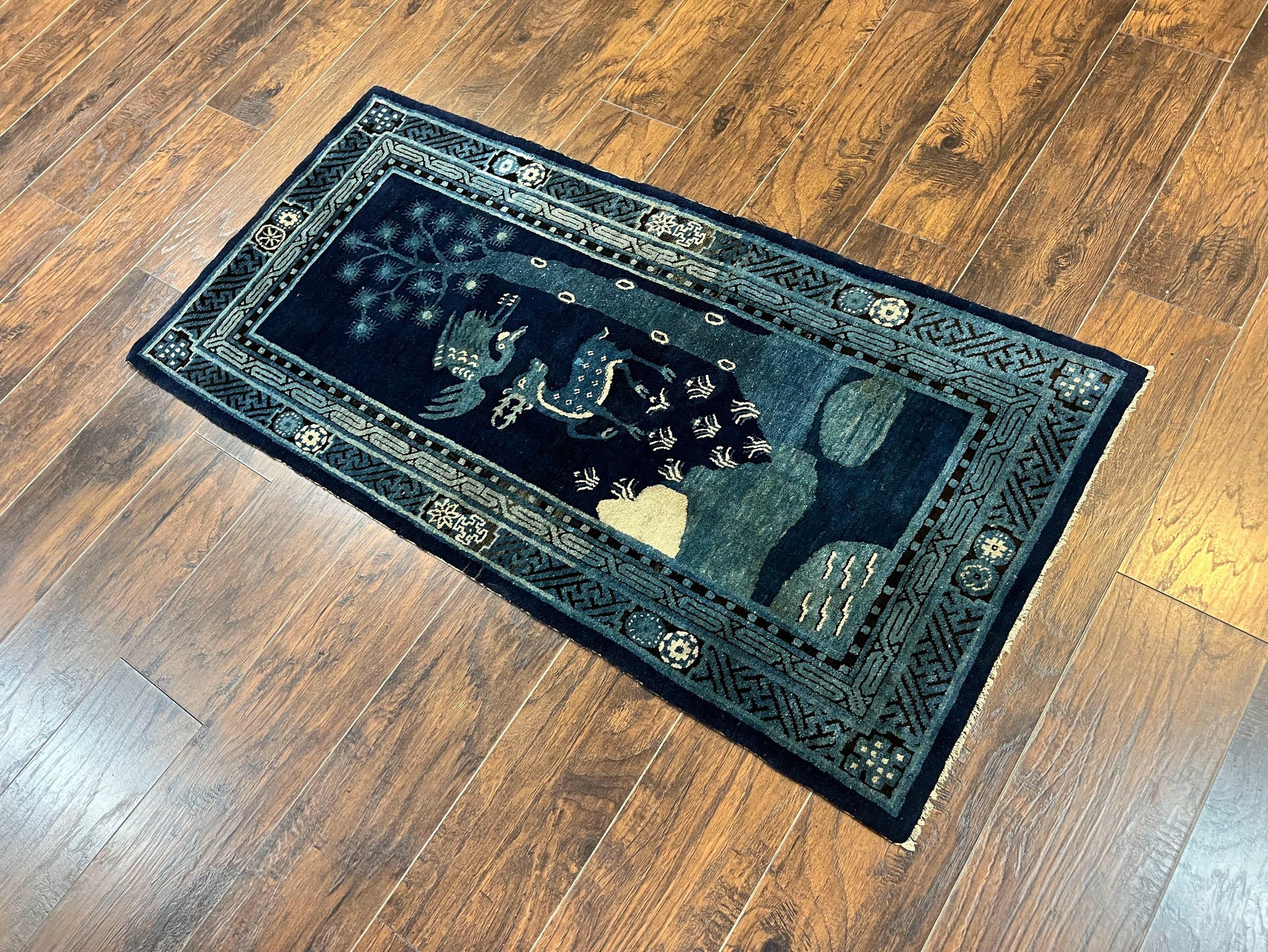 Experience timeless Chinese artistry with this Antique Peking Rug. Hand-knotted from wool and dating to the 1920s, this dark blue rug with animal pictorials adds a refined focal point to living spaces.