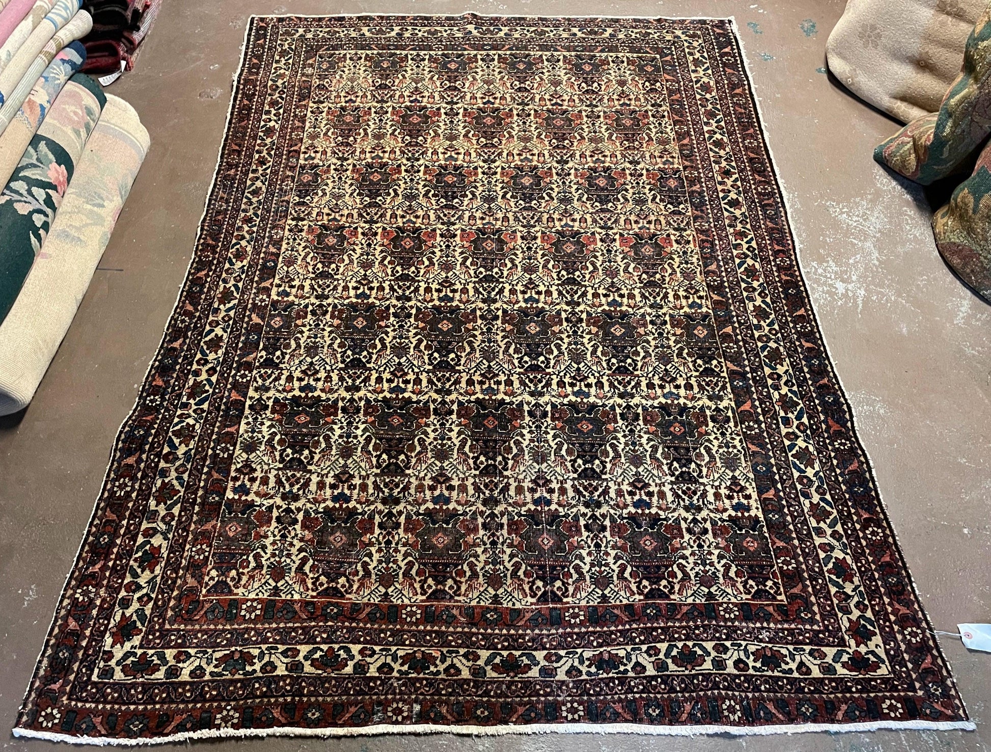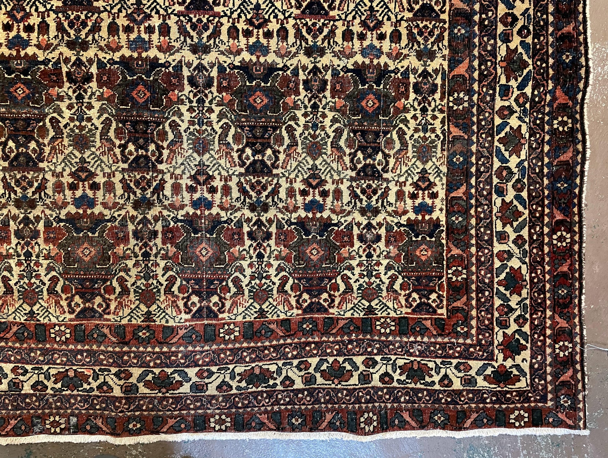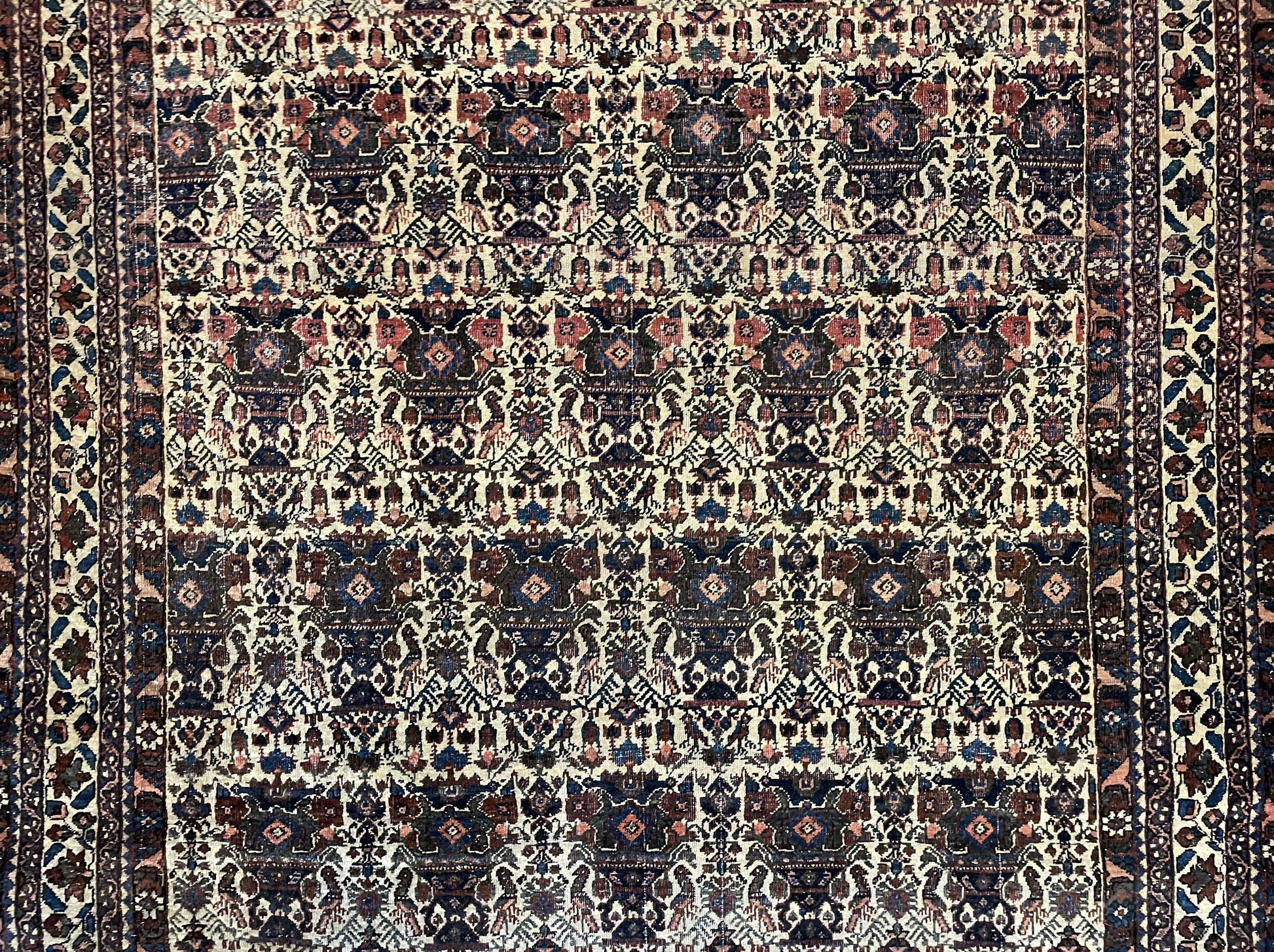 Condition Notes: A beautiful antique genuine oriental rug in good condition. Features unique repeated motif design with many birds. Free of stains, odors, discolorations, tears, etc. Has areas of medium pile. Recently cleaned and ready to be enjoyed in your space.