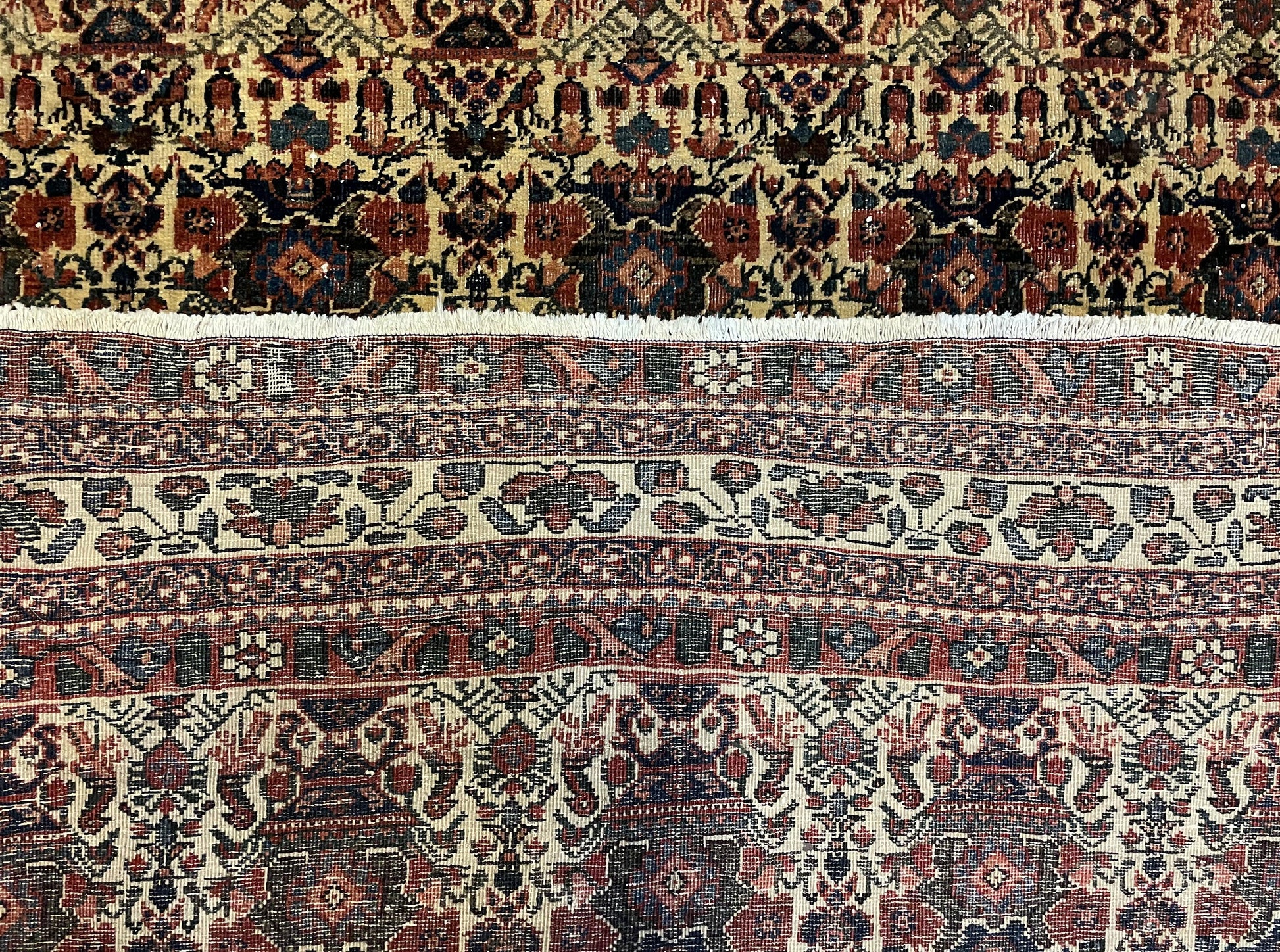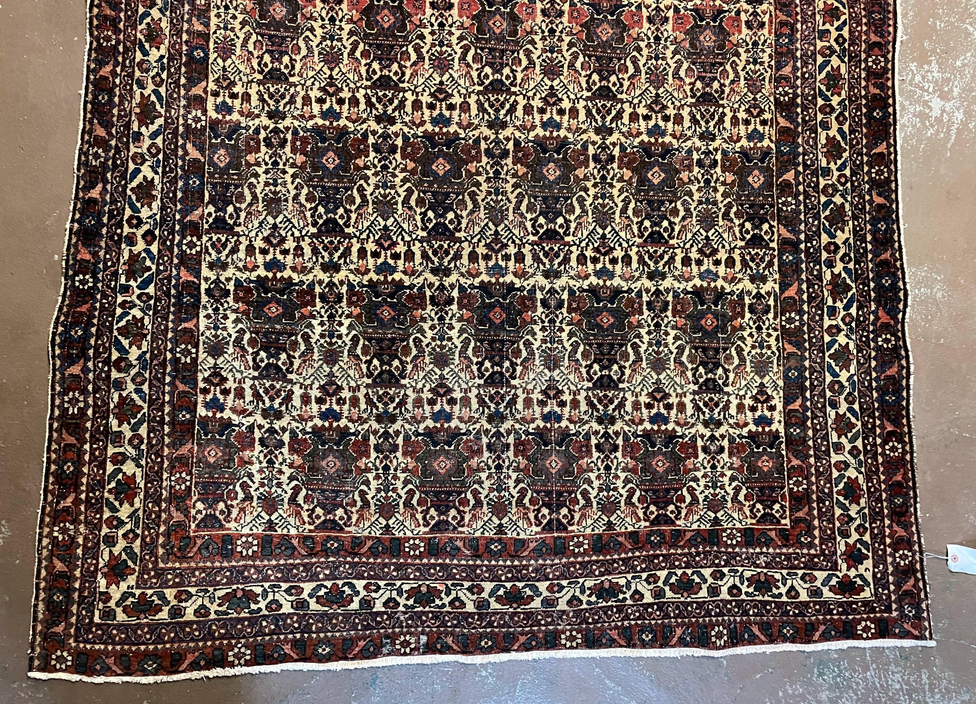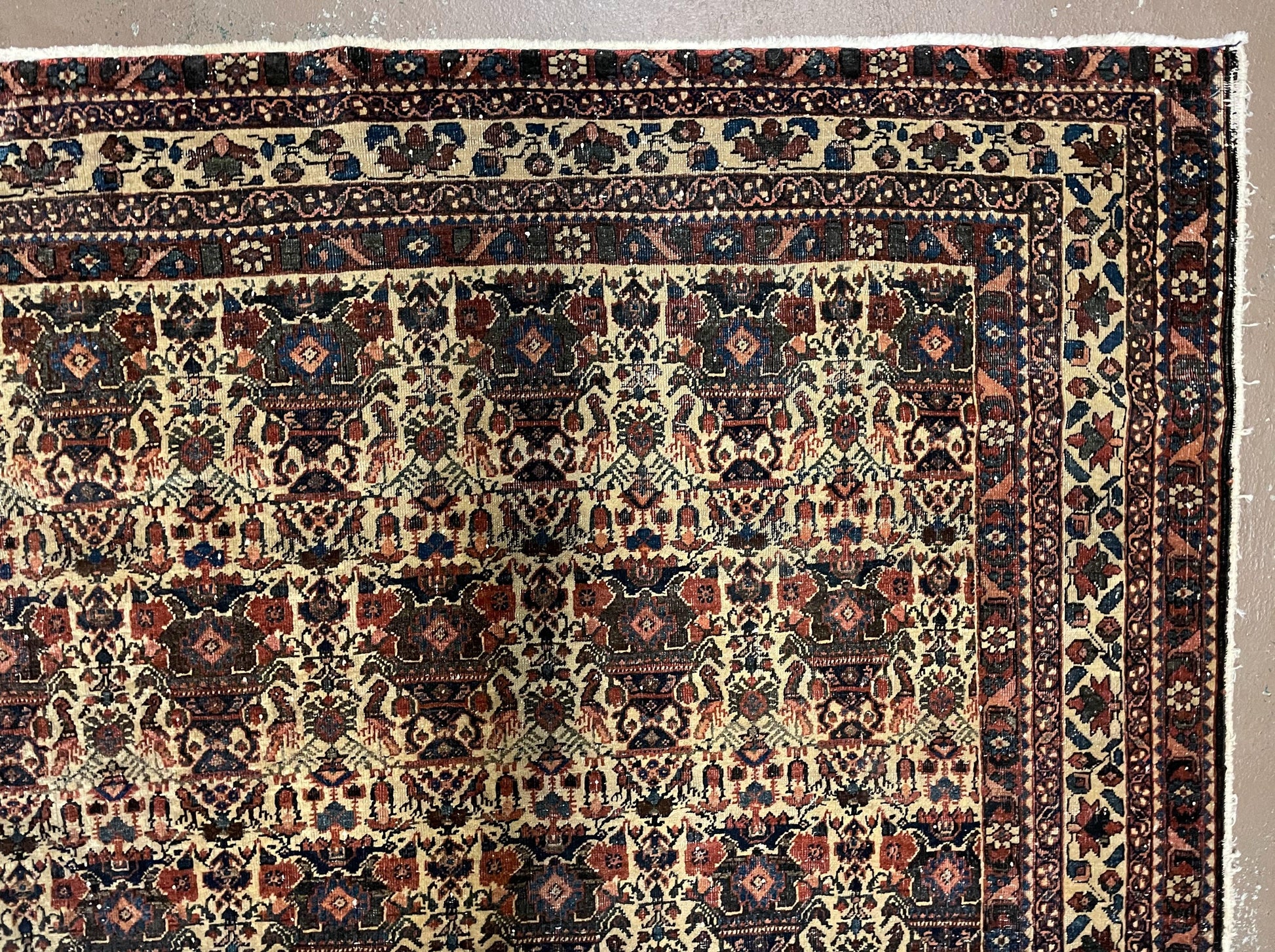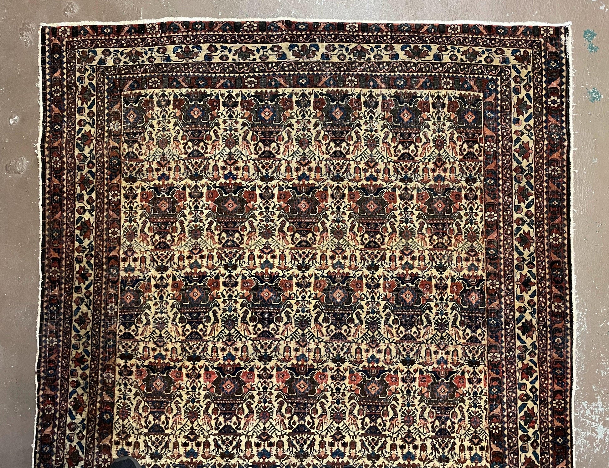 Condition Notes: A beautiful antique genuine oriental rug in good condition. Features unique repeated motif design with many birds. Free of stains, odors, discolorations, tears, etc. Has areas of medium pile. Recently cleaned and ready to be enjoyed in your space.