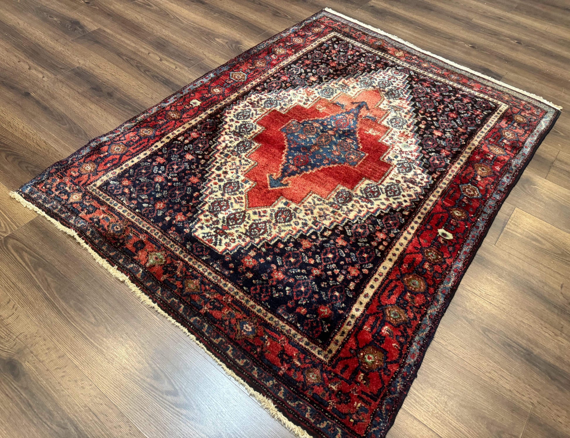 Senneh Rug Antique Persian Kurdish 4x5 Wool Geometric Medallion Carpet