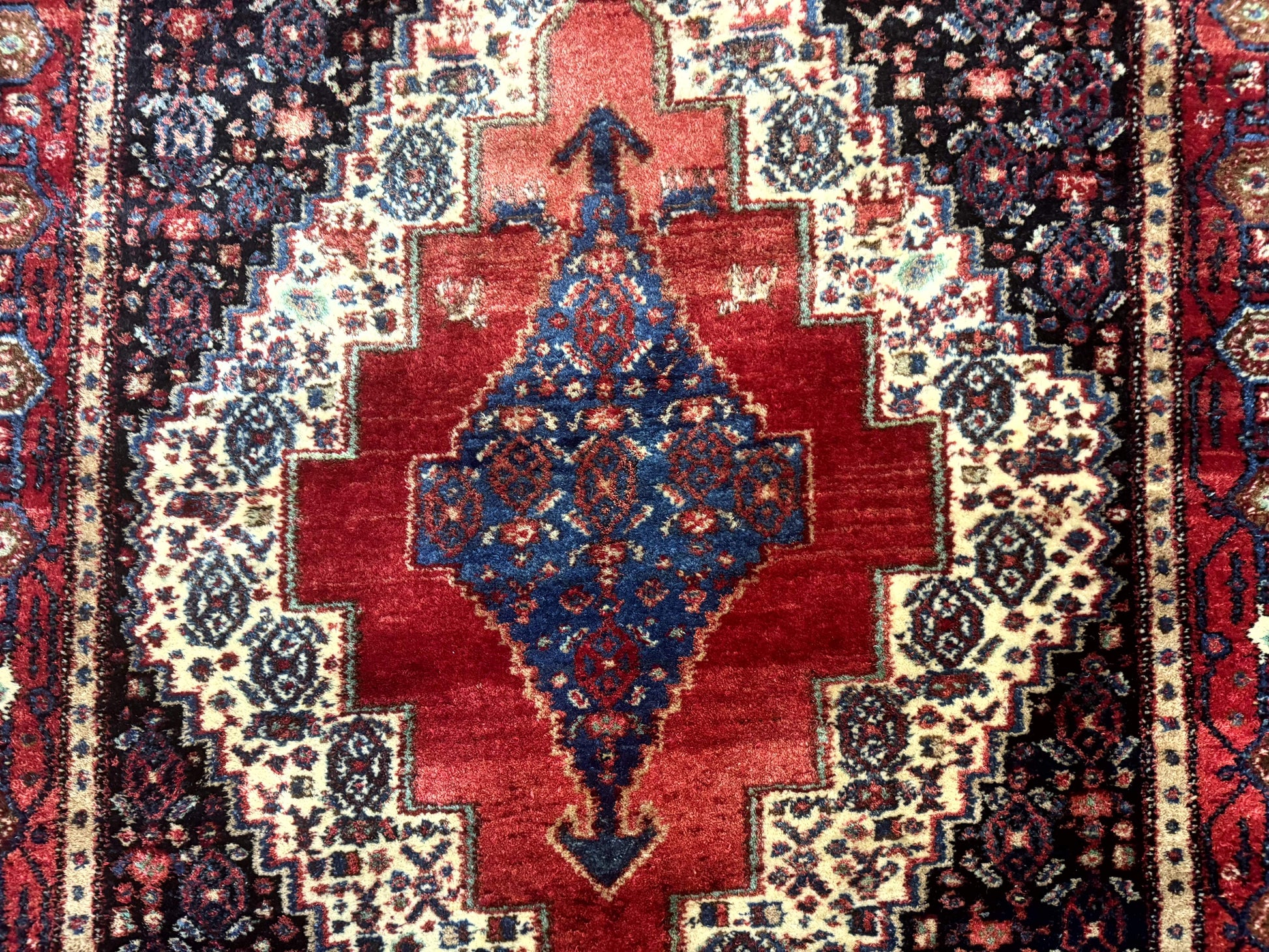 - Design: Bold stepped diamond medallion with intricate floral motifs; strongly geometric