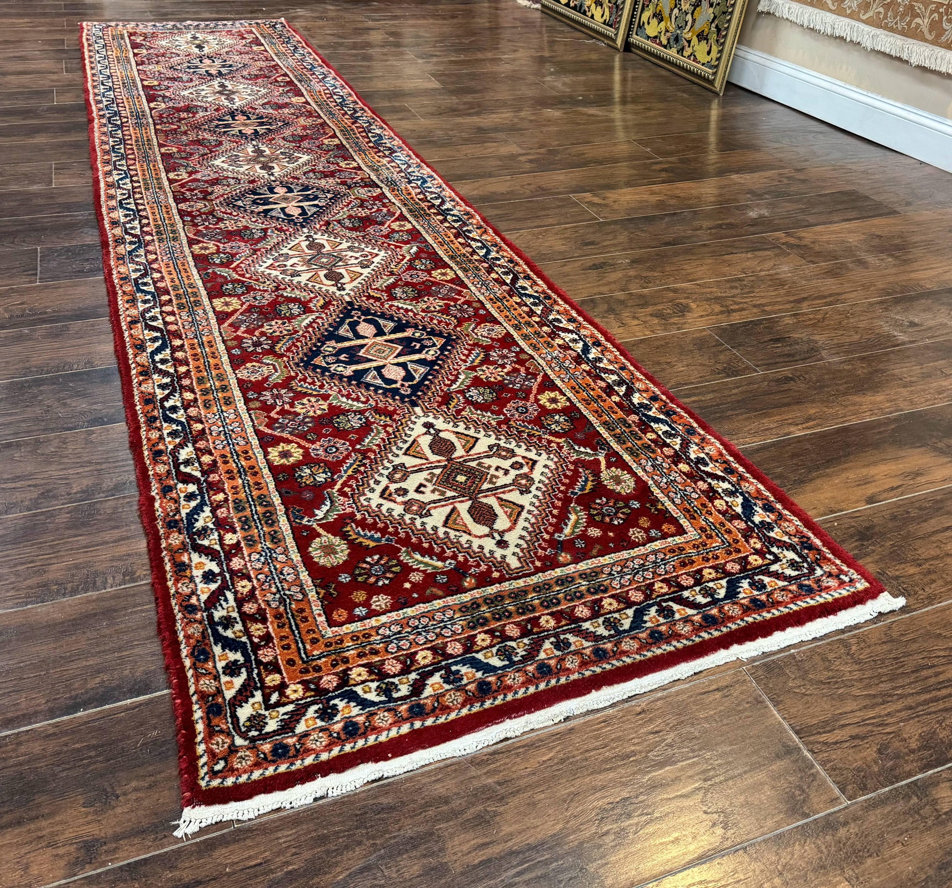 Antique Persian Qashqai Runner Rug 3 x 13 ft, Tribal Runner, Geometric Medallions, Red Ivory Blue, Wool