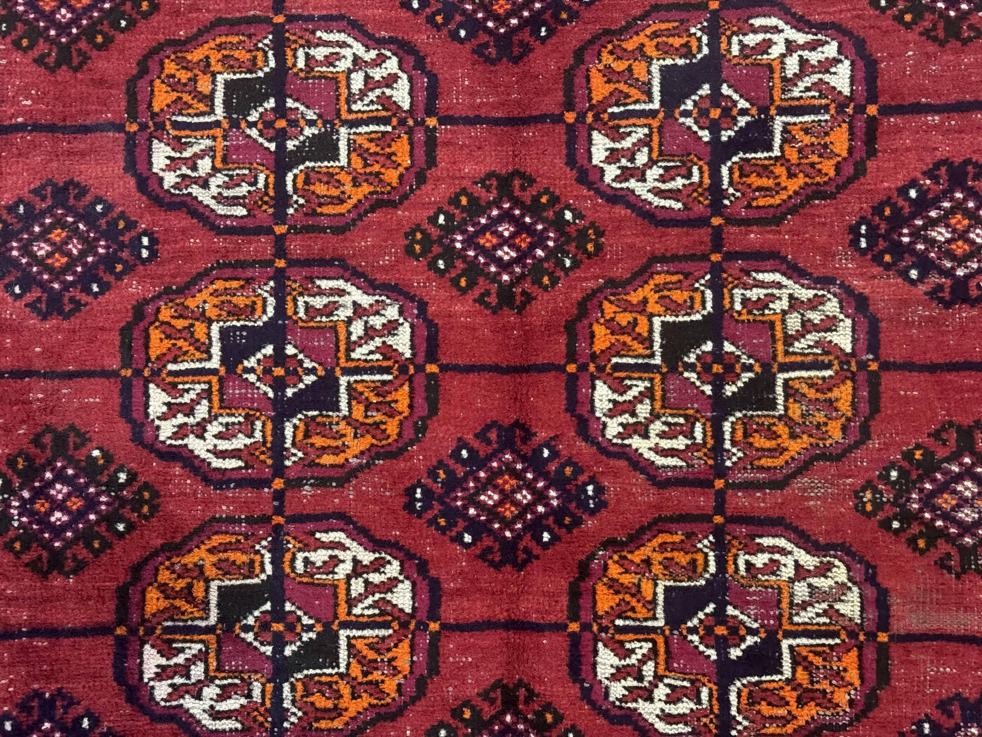 This particular rug stands out for its bold color palette and well-preserved condition. The repeating gul motifs are finely rendered. A vintage piece from the 1940s, it’s both decorative and collectible.