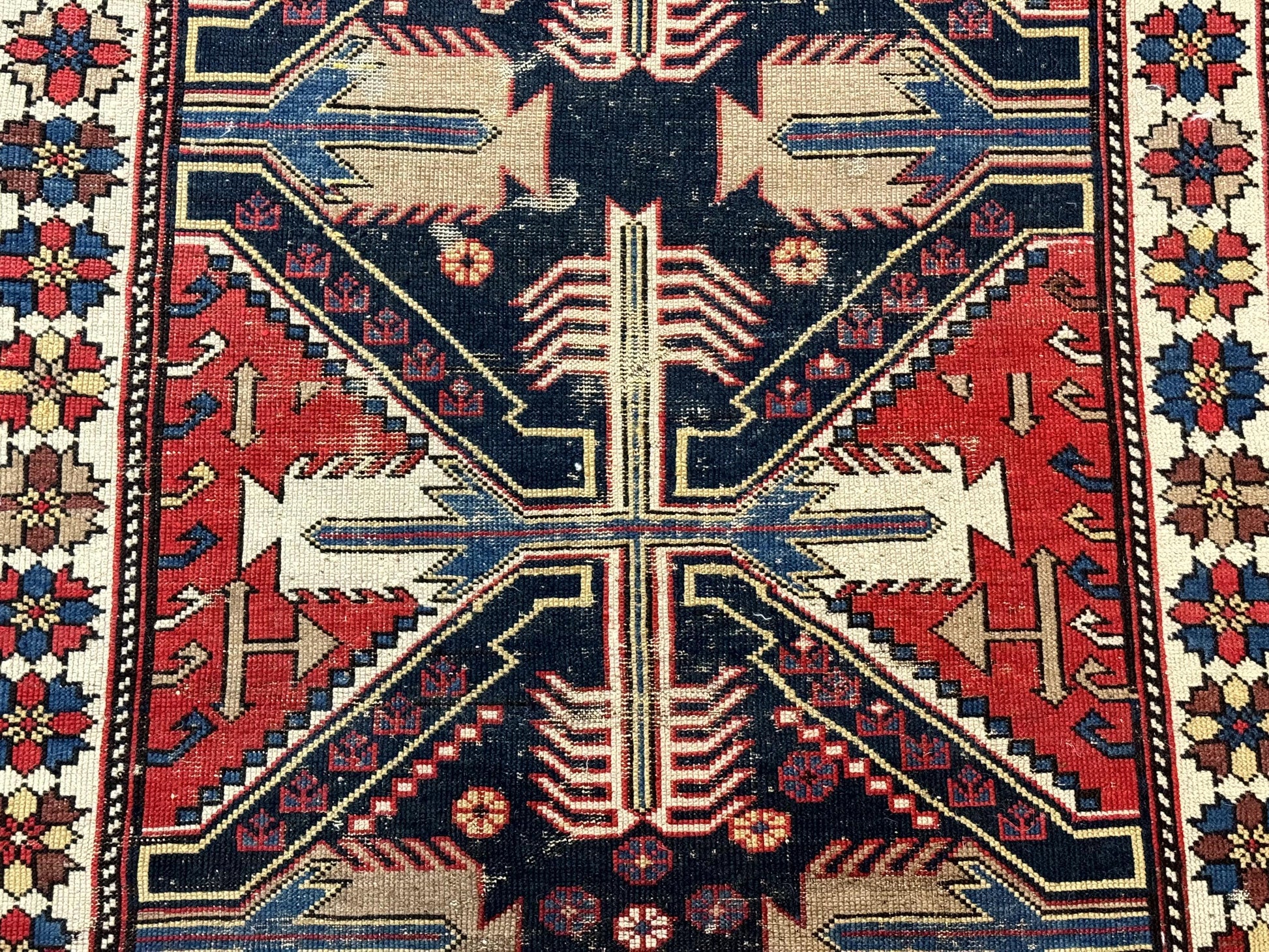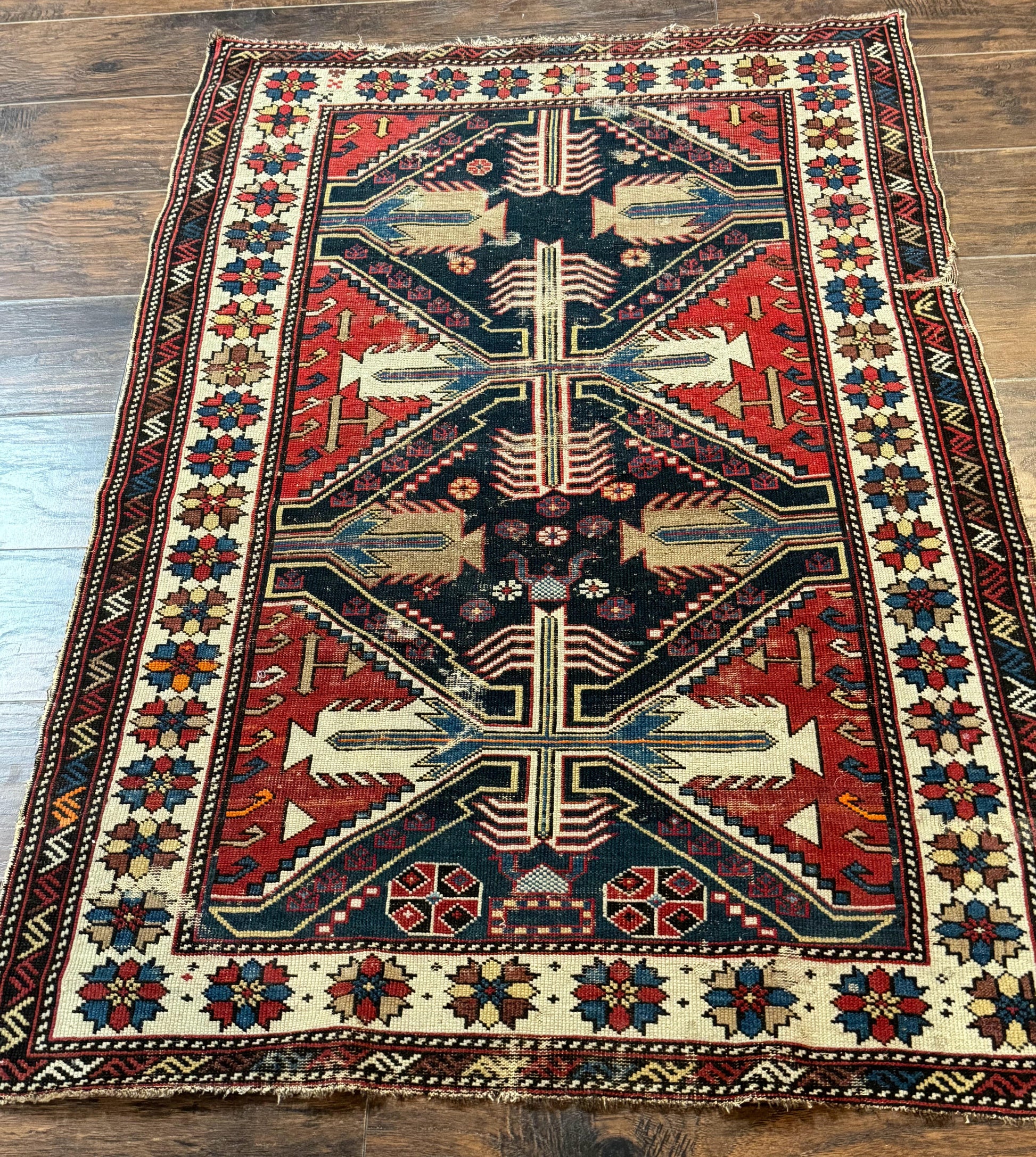 Antique Shirvan Caucasian Rug 3x5 Geometric Wool Hand Knotted Red Navy Beige