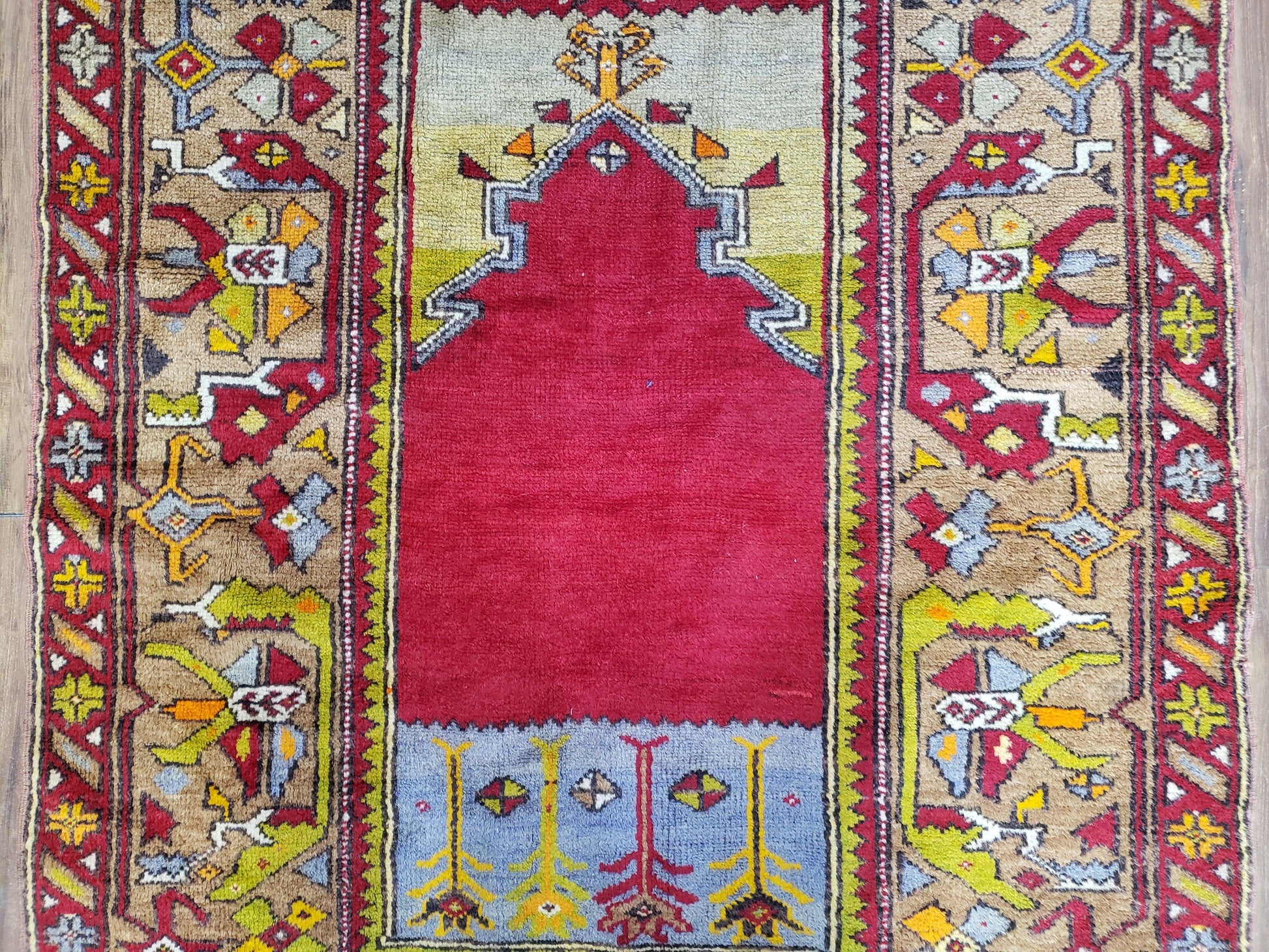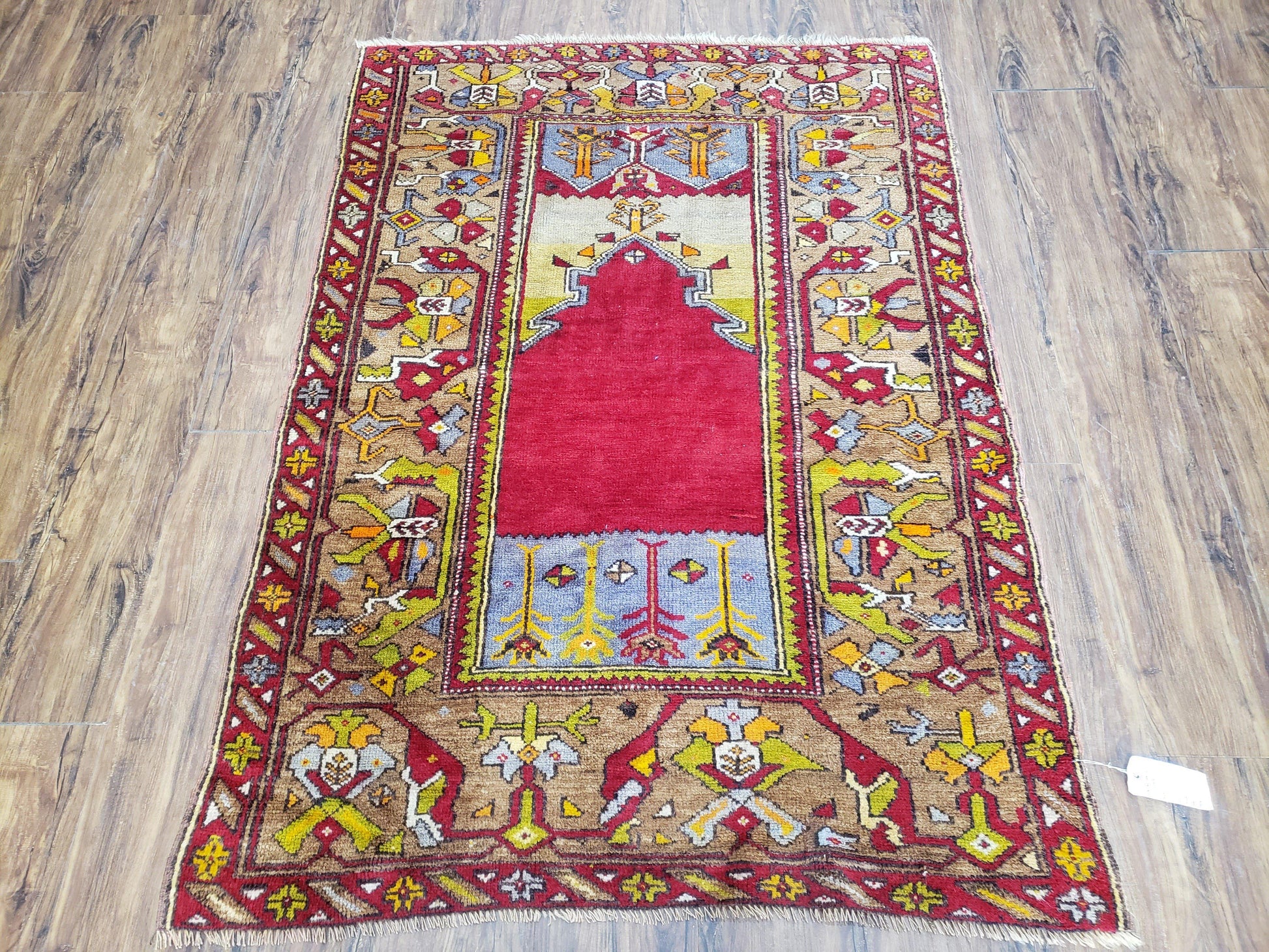 Antique Turkish Prayer Rug Handwoven Wool 3.8 By 5 Feet Colorful Red Blue Gold Anatolian Carpet