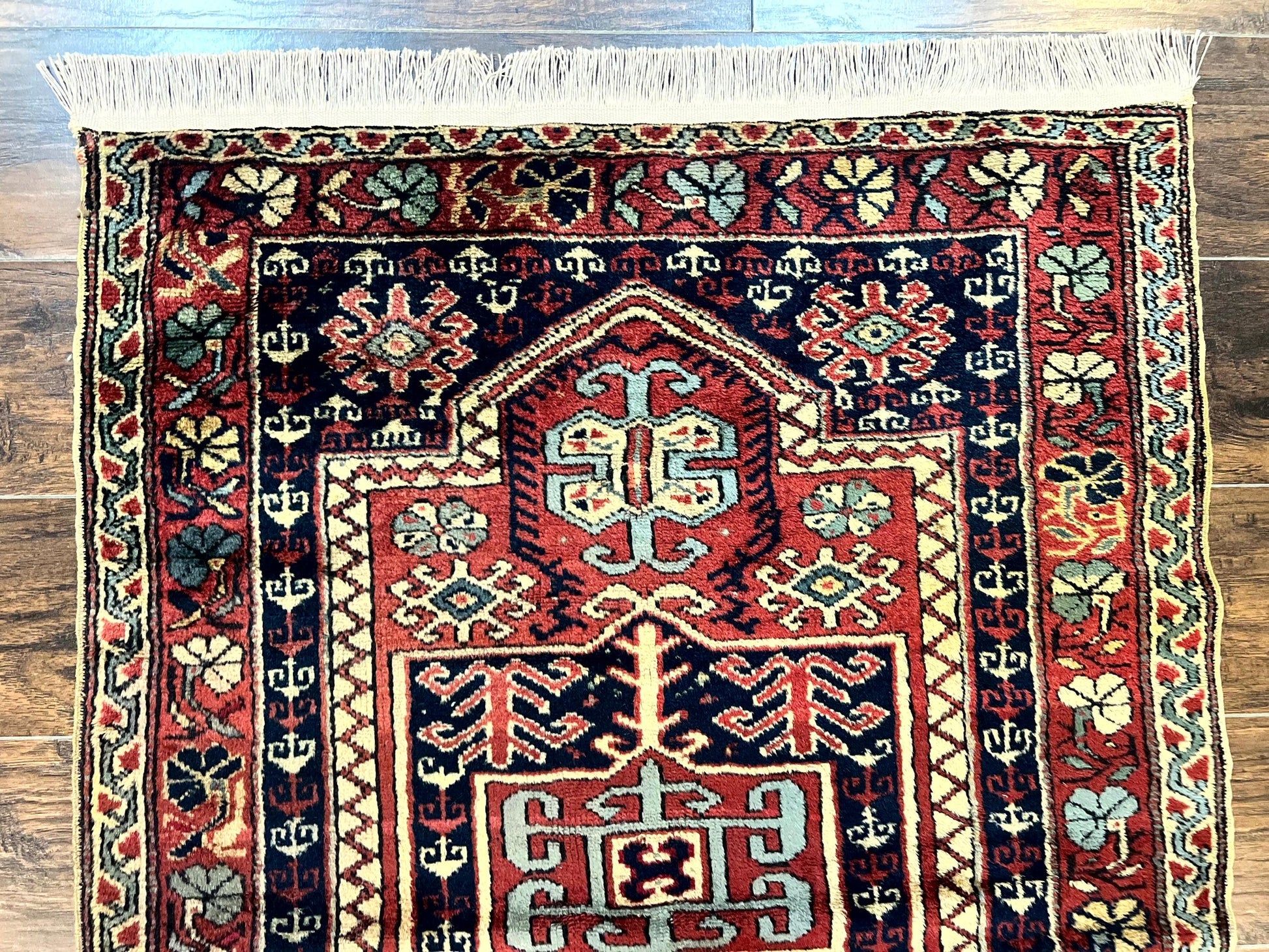 Experience authentic charm with an antique Turkish Sparta rug. Hand-knotted in Turkey from wool, this vintage Kazak area rug features a geometric Caucasian pattern in a versatile navy, red, and cream palette—perfect for elevating any living space.