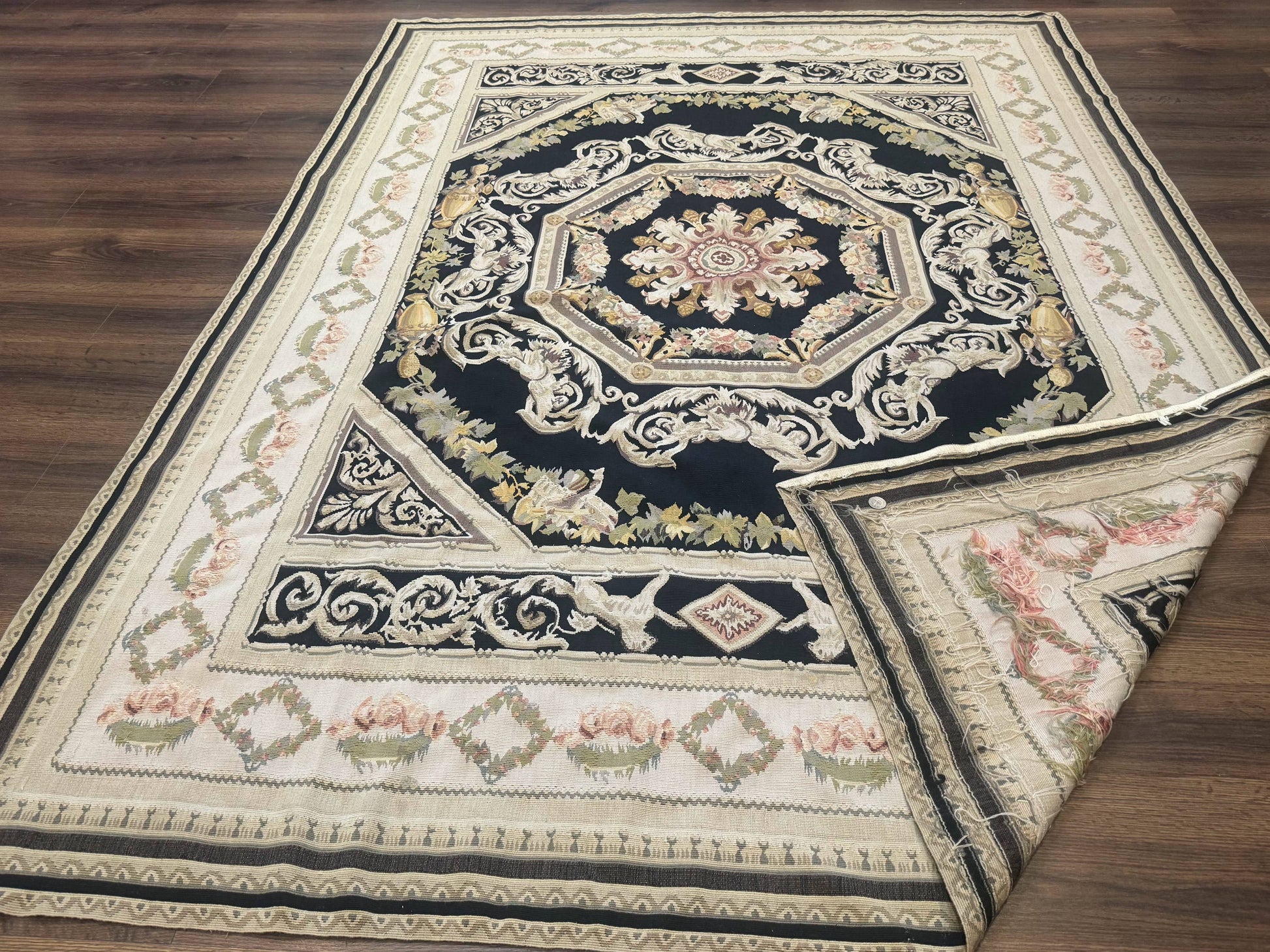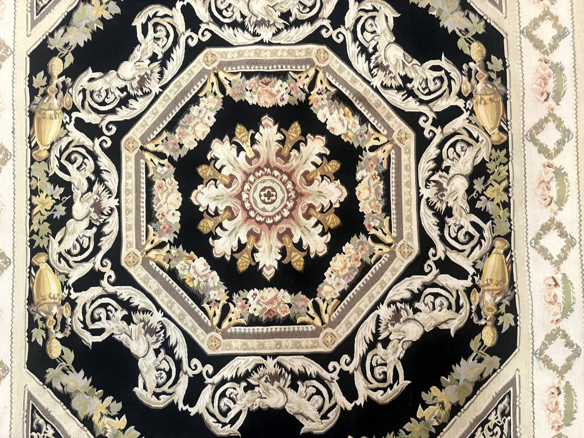 - Design: European Aubusson style with lion pictorials