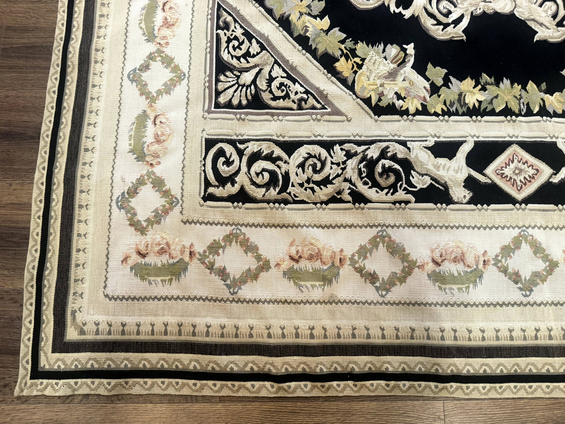 Vintage Aubusson Rug 6x8 Wool Hand Knotted European Design Lion Pictorial Black