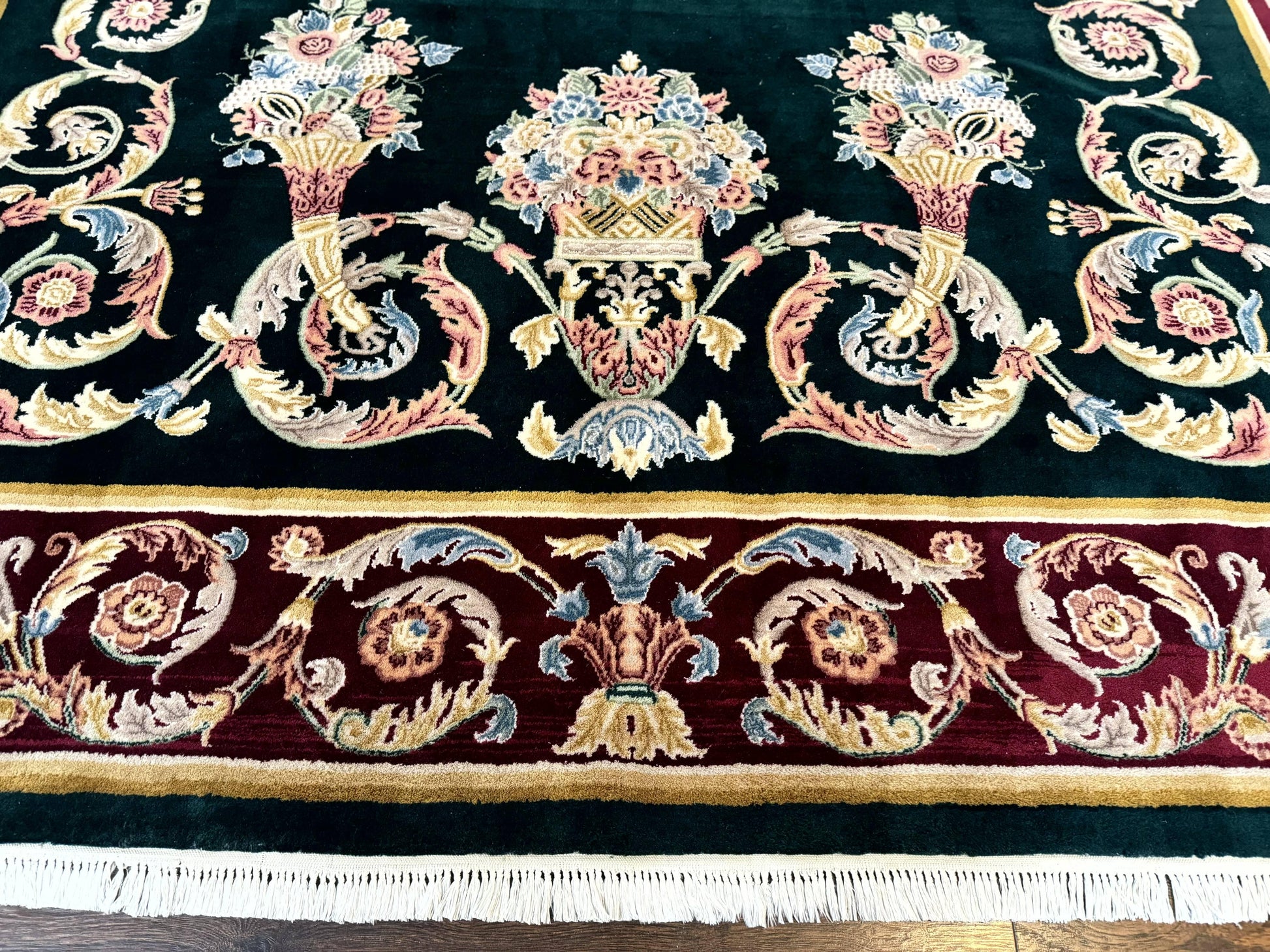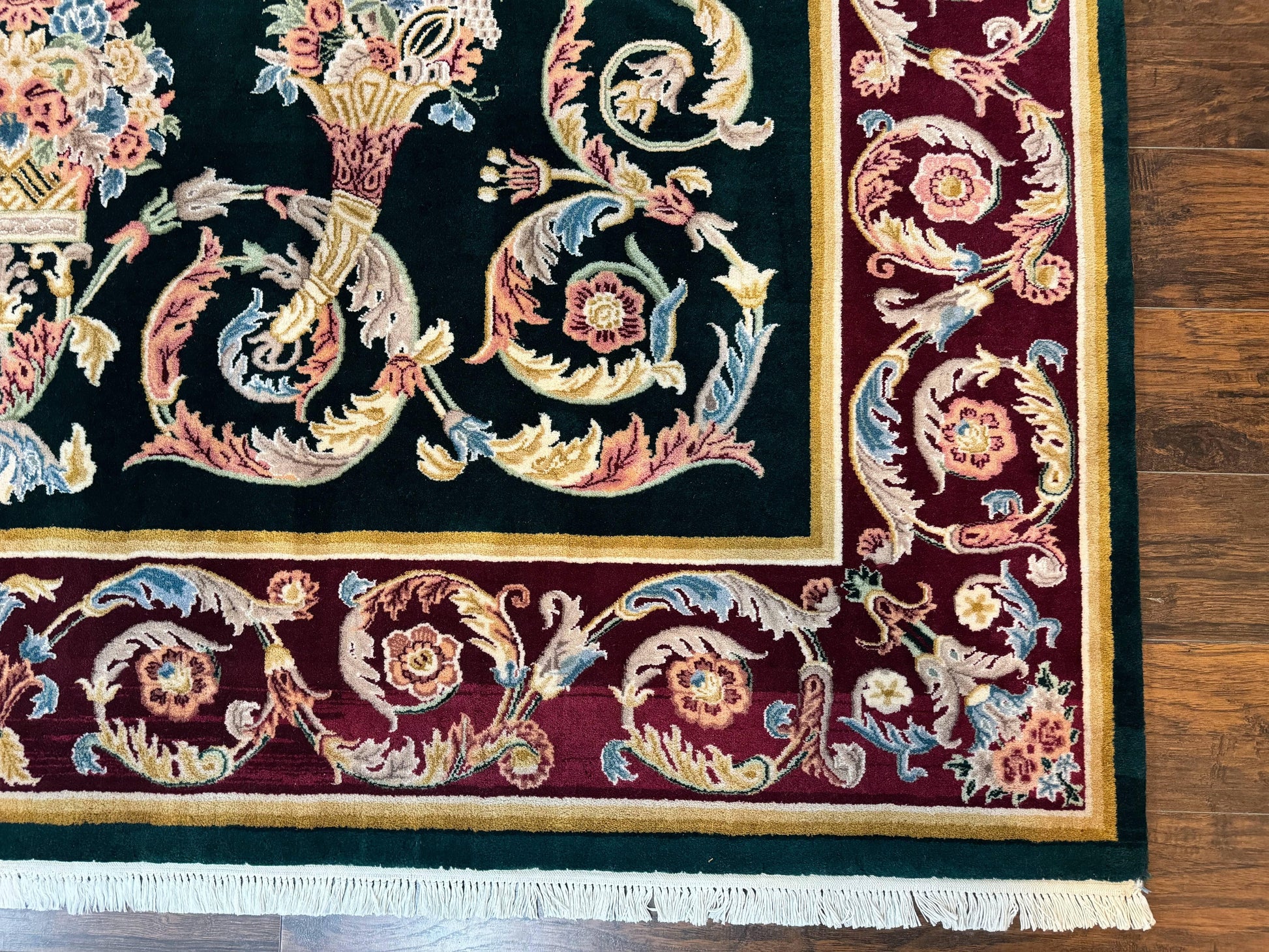 Aubusson Rug 9x12 Hand Knotted Wool Vintage European Design Dark Green Elegant Carpet