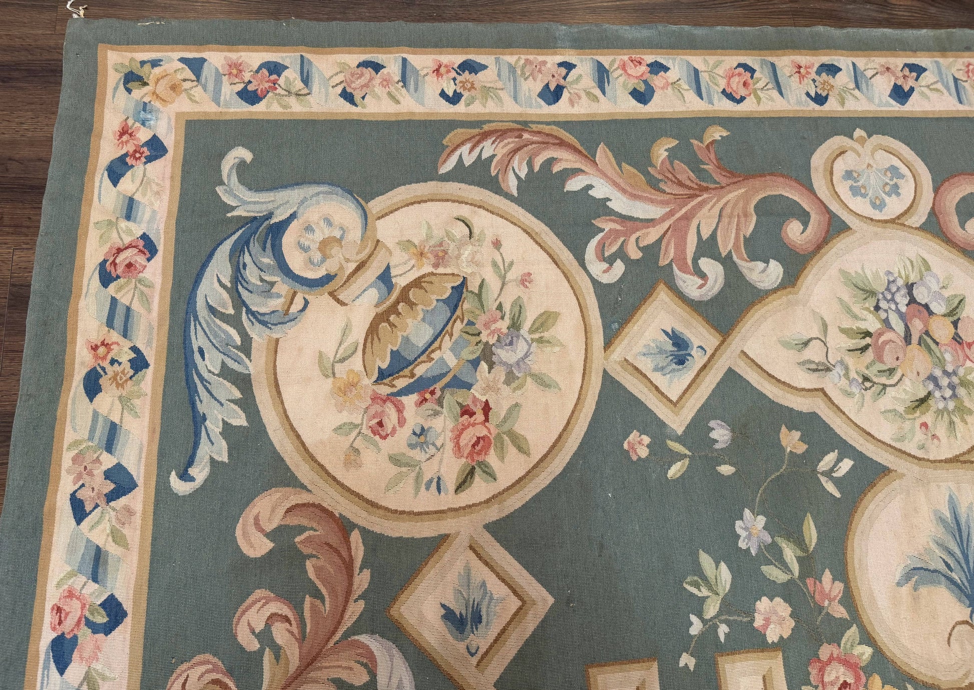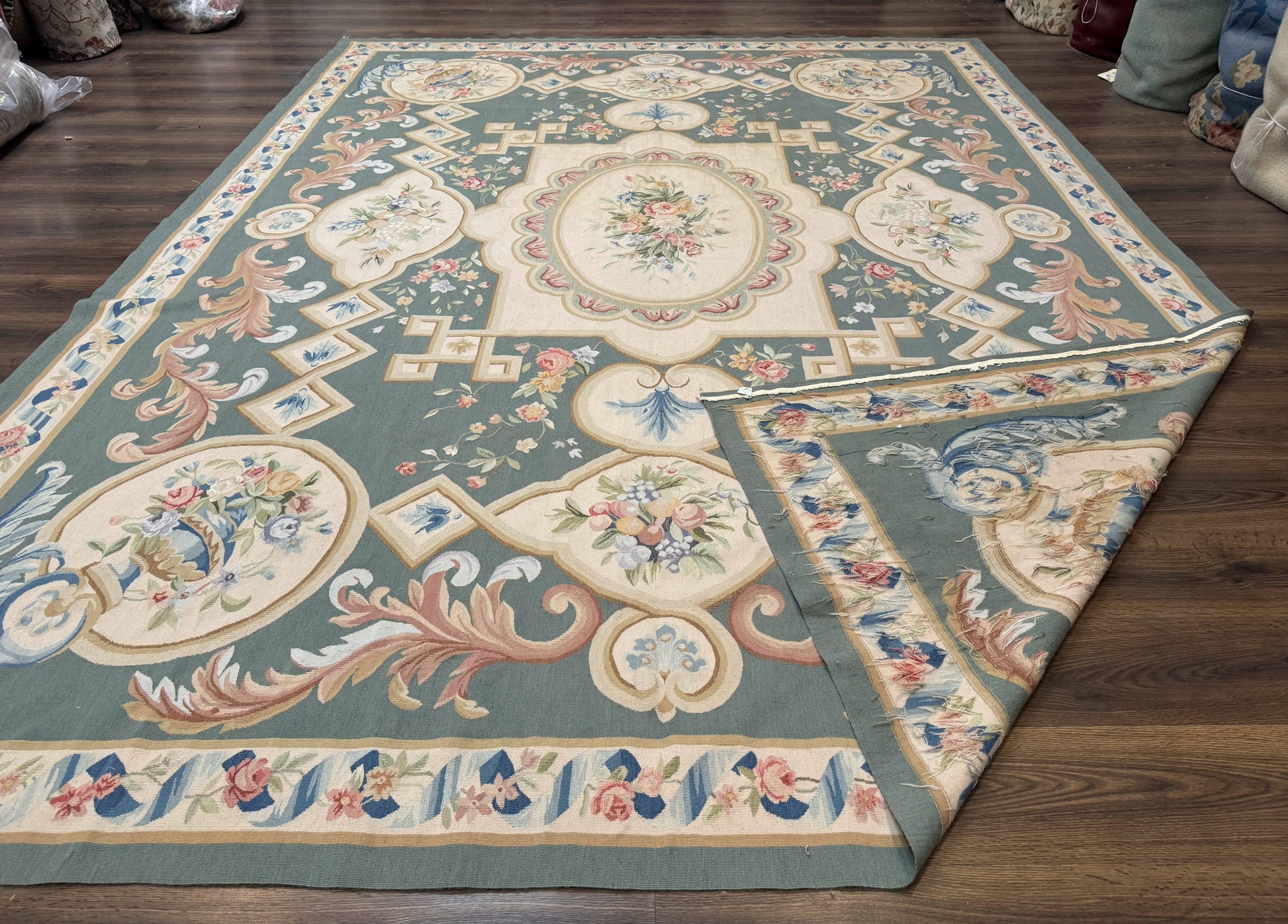 Aubusson Rug 9x12 Muted Sage Green Cream European Design Handwoven Wool