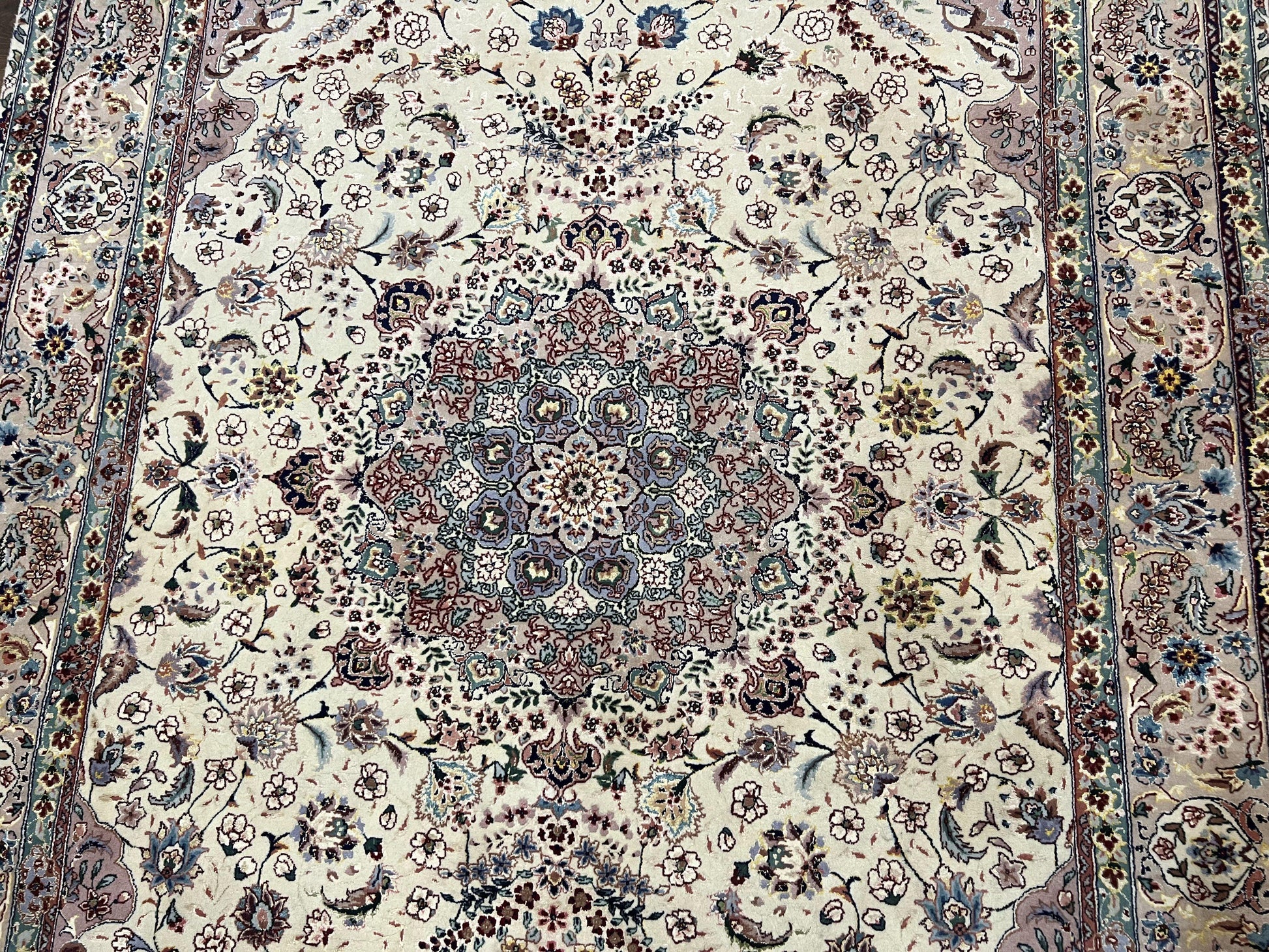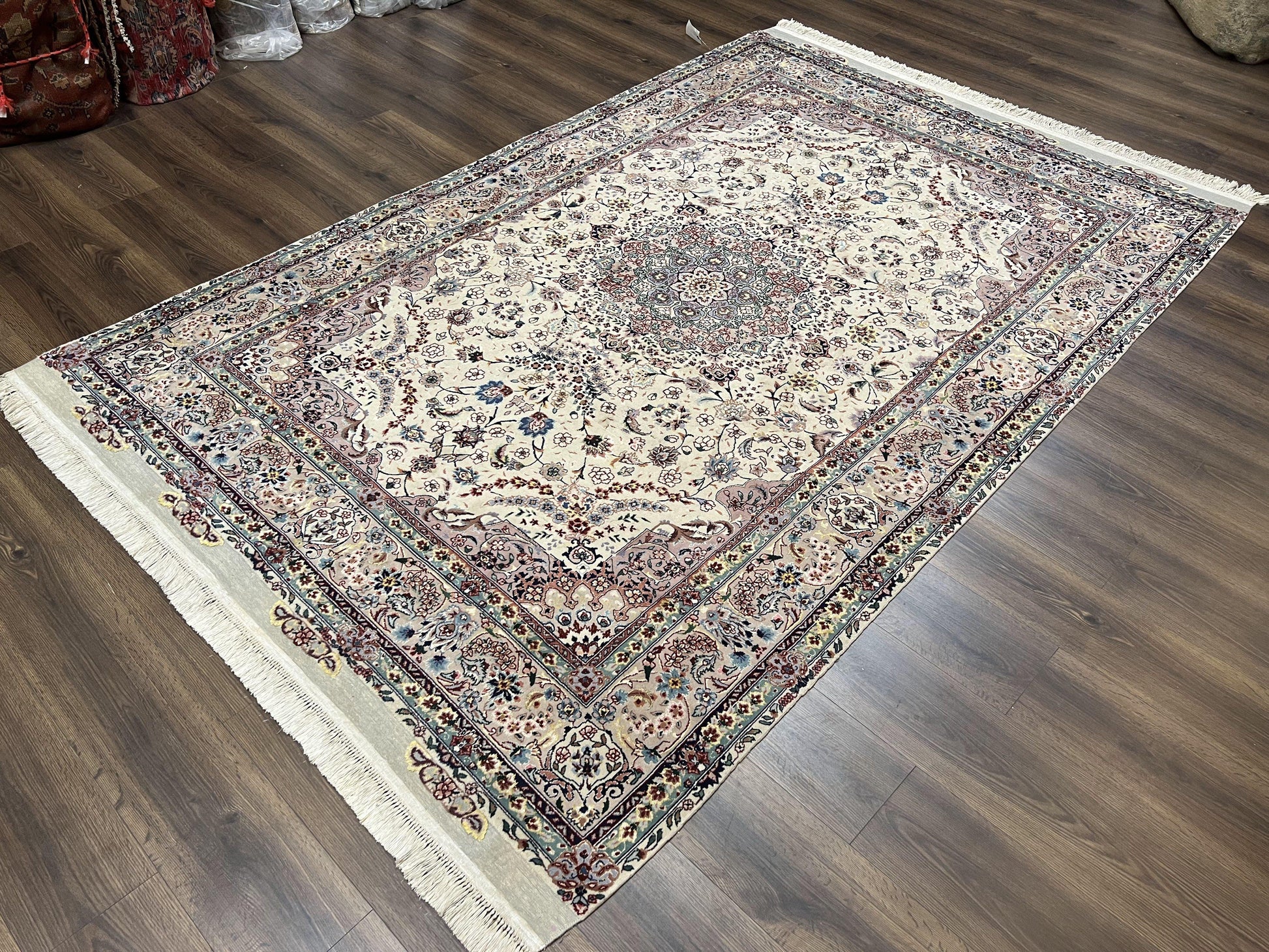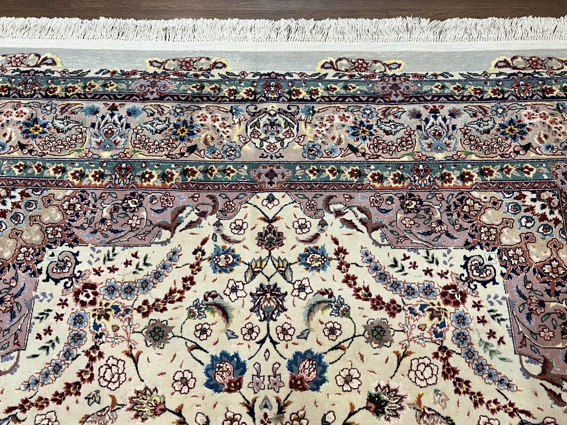 Persian Rug 6x9 Floral Medallion Wool Silk Handmade Vintage Oriental Cream Gray
