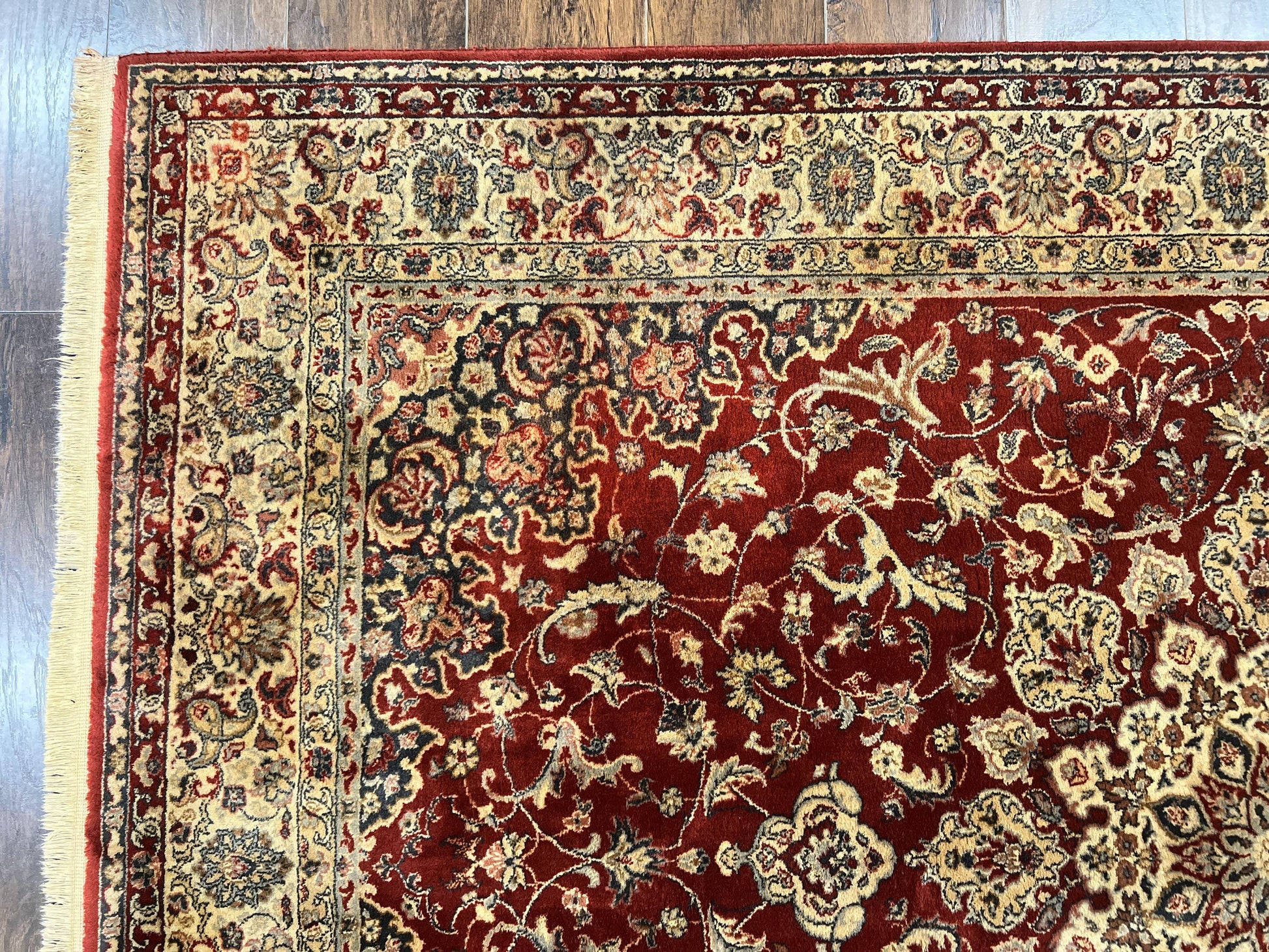 Elevate your space with this vintage-inspired wool rug featuring a classic floral medallion in a rich dark red and cream palette. Crafted in Belgium using power-loomed techniques, this Couristan piece brings durable elegance to living rooms, bedrooms, or dining areas.