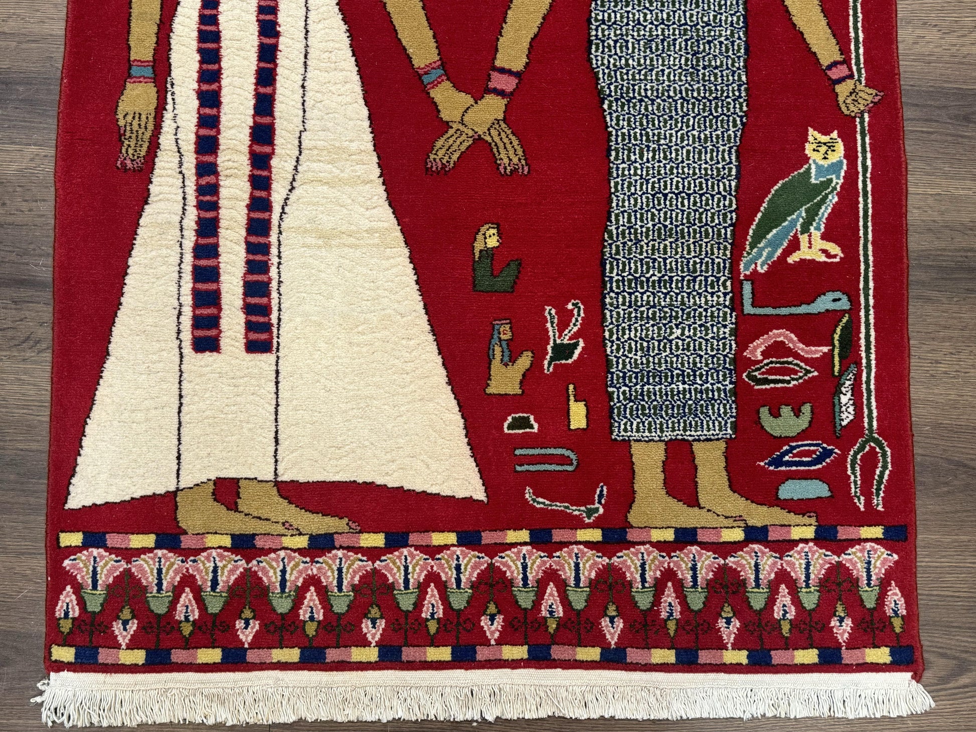 Egyptian Pictorial Rug 3x4, Hieroglyphic Pictorial Rug, Egyptian Prince and Princess, Cleopatra, Vintage Handmade, Red