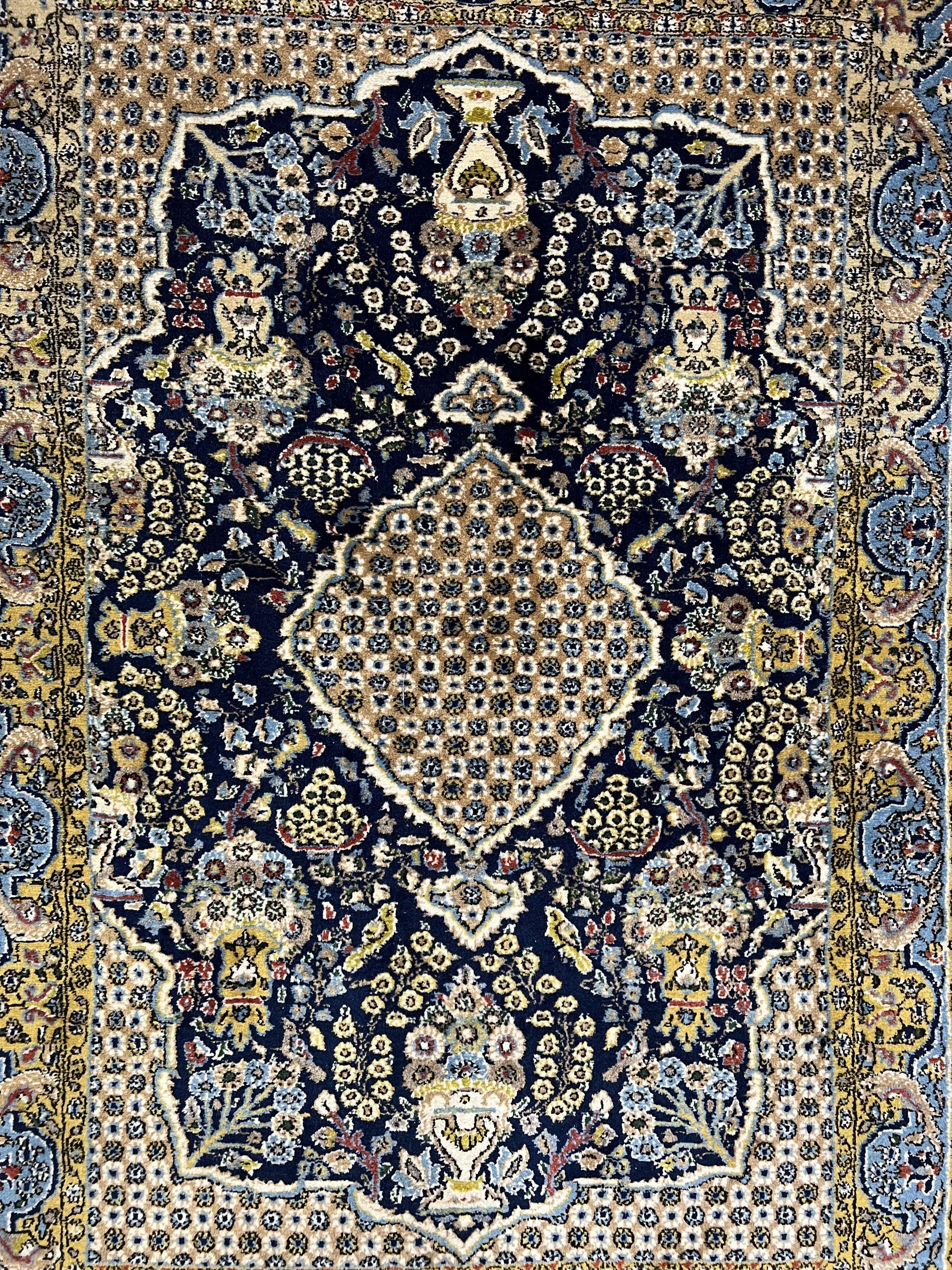 Fine Persian Qum Rug 3x5, Semi Antique Vintage Oriental Ghom Carpet, Floral Medallion, Highly Detailed, Hand Knotted, Navy Blue, Wool Area Rug, Birds