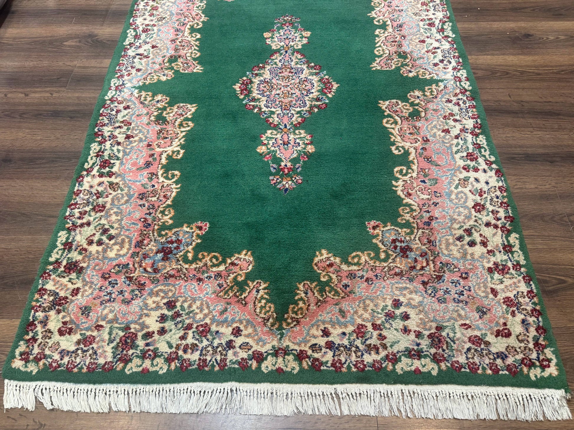 Green Persian Kerman Rug 4x6 Vintage Semi Open Field With Cream Borders