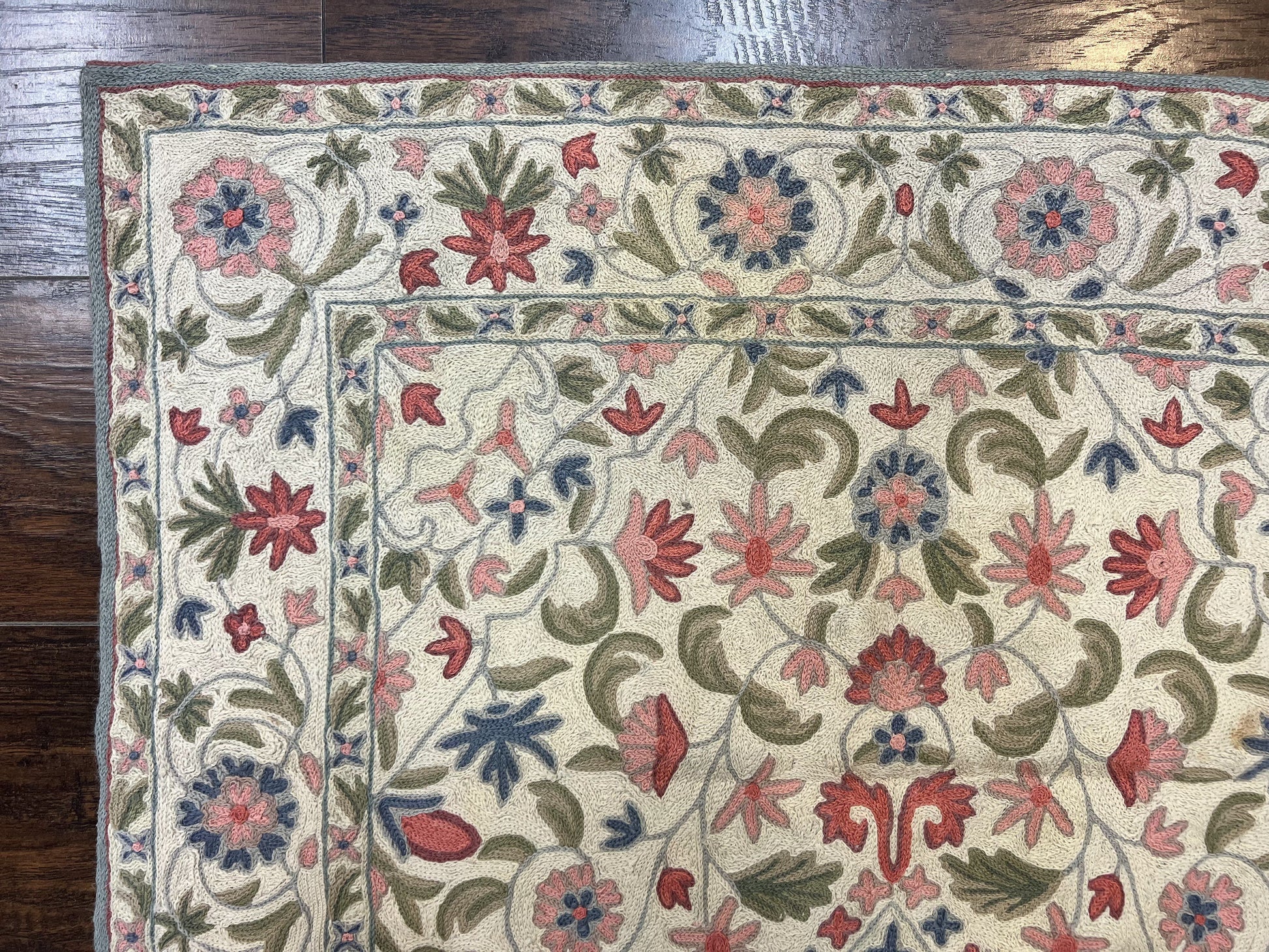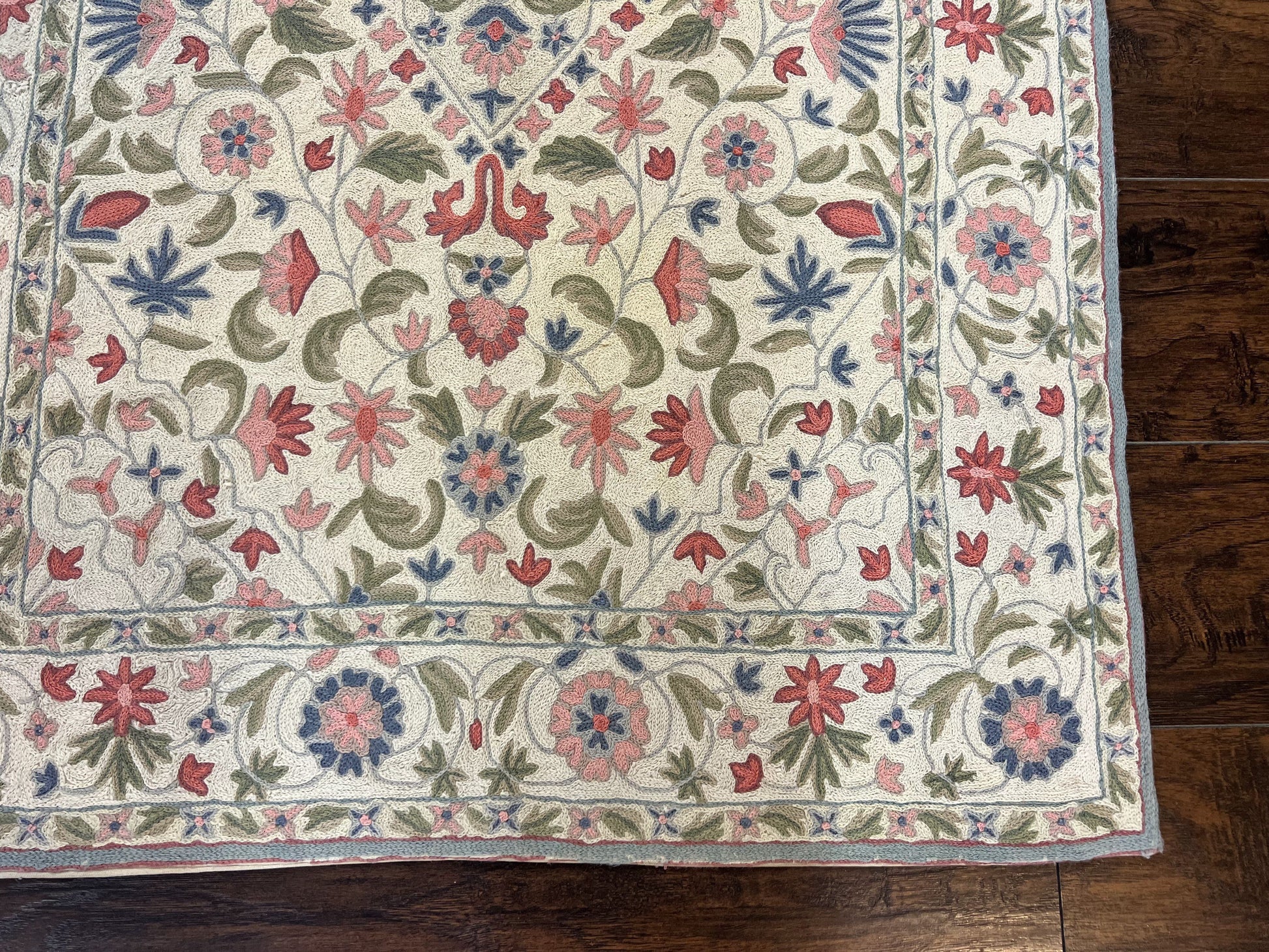Hand Stitched Indian Rug Floral Vintage Wool Area Rug 4x5 Hand Embroidered