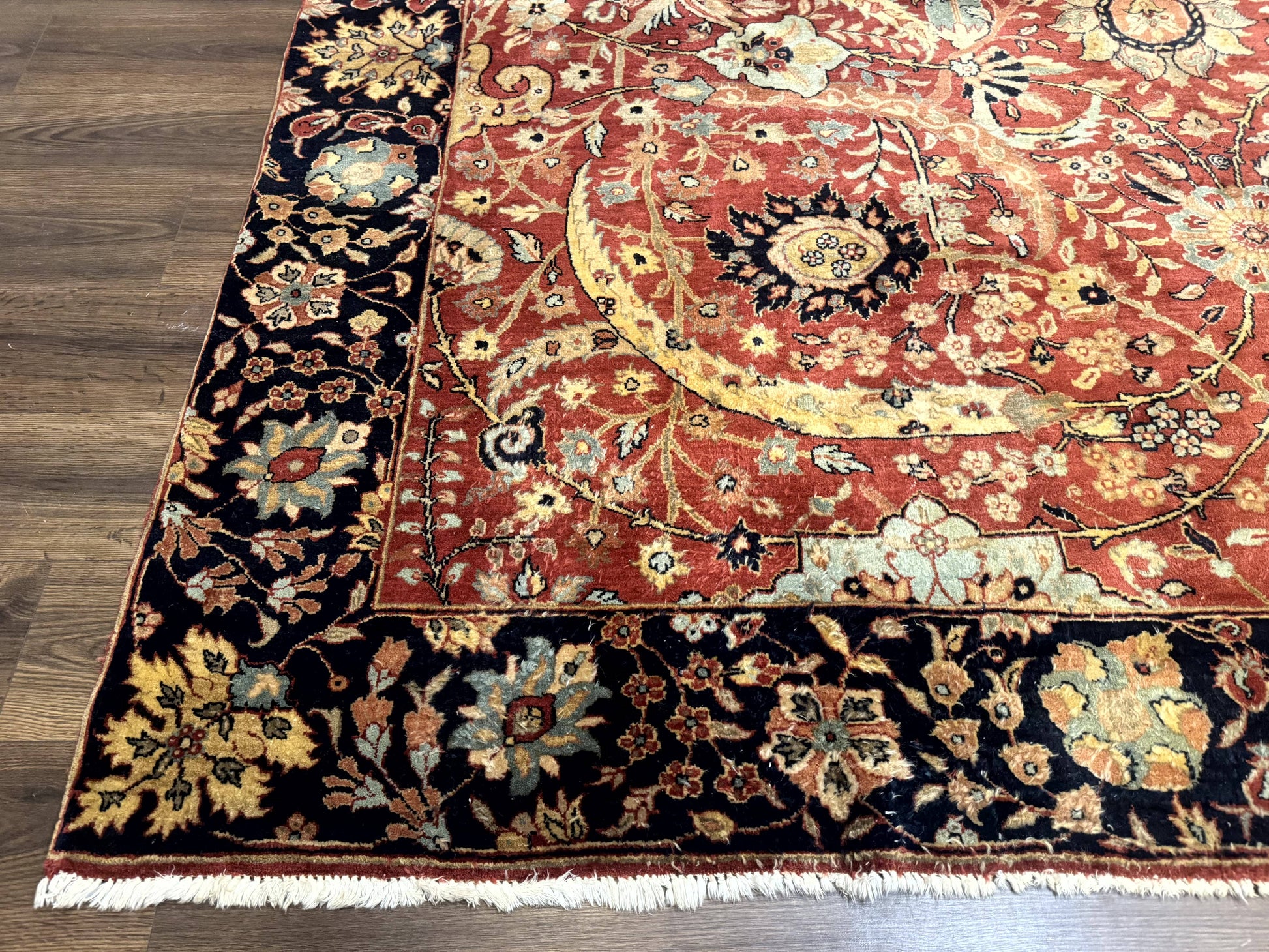 Indian Agra Rug 9x11, Terracotta and Navy Blue, Sickle Leaf Rug