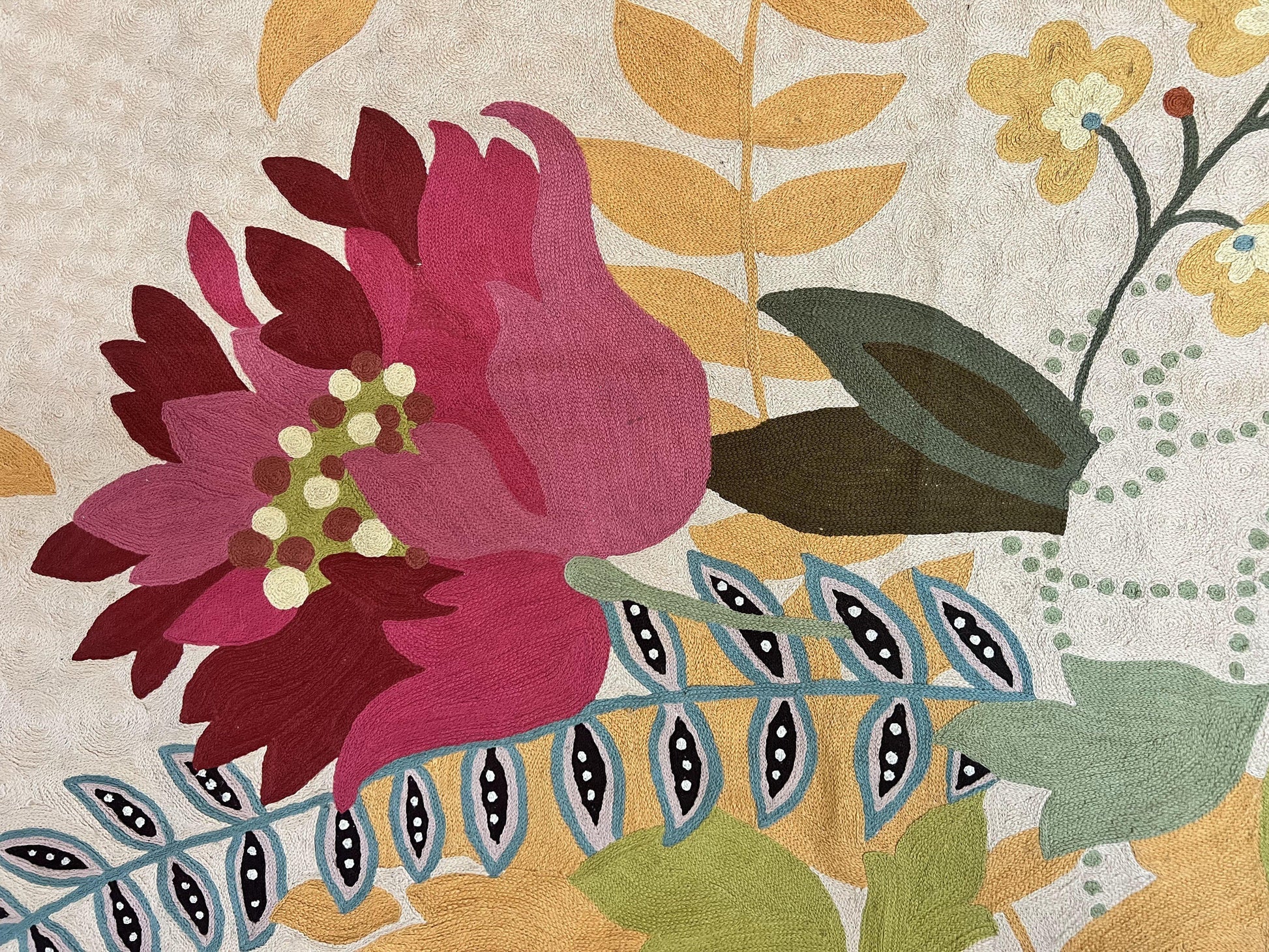 A beautiful vintage handmade hand-stitched silk floral area rug from India, sized 4' x 6'. This handcrafted piece brings timeless elegance and a touch of artistry to living rooms, bedrooms, or entryways.