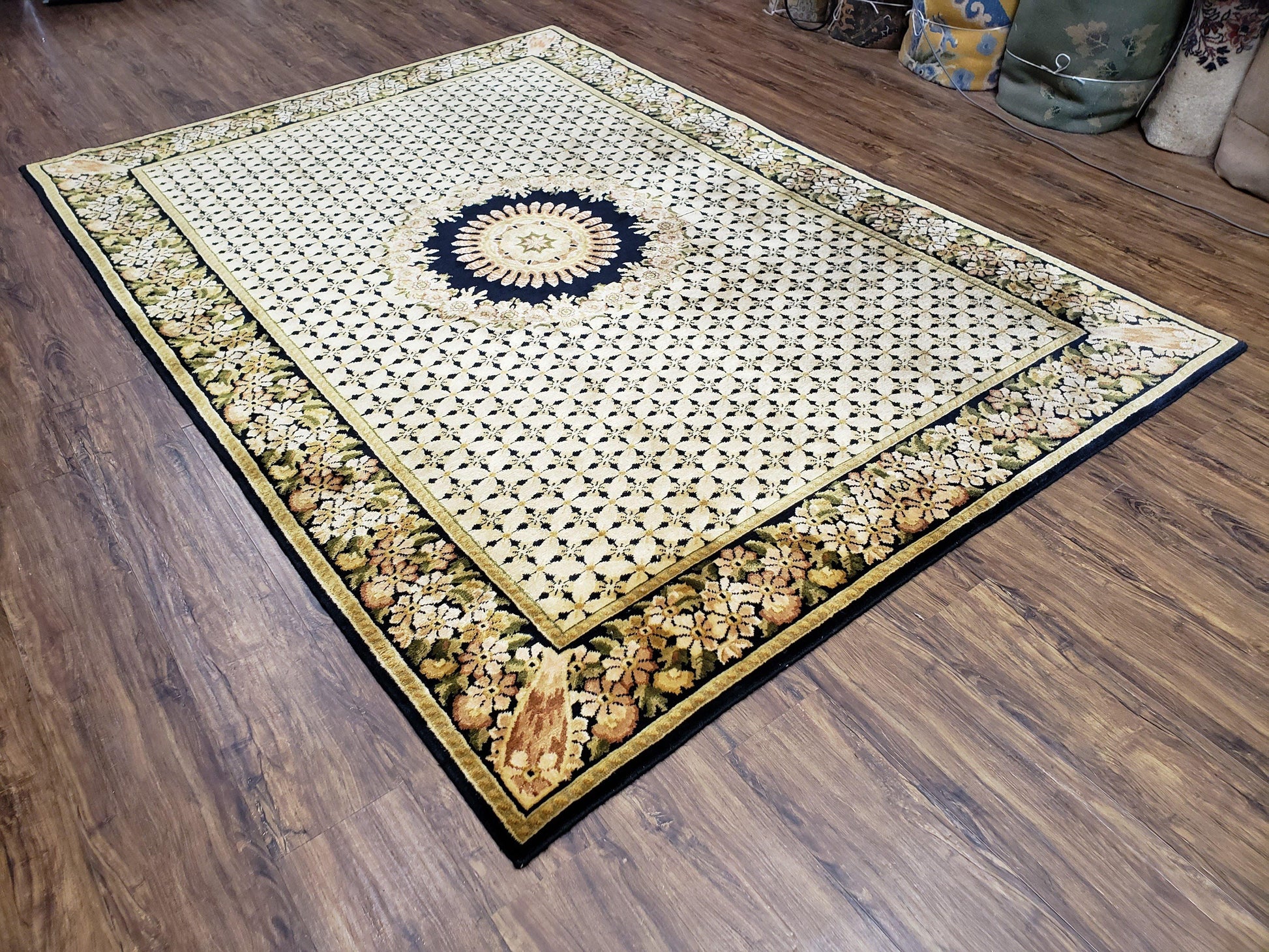 Indo Tibetan Wool Rug Handmade 6x8 Floral Border In Black Cream